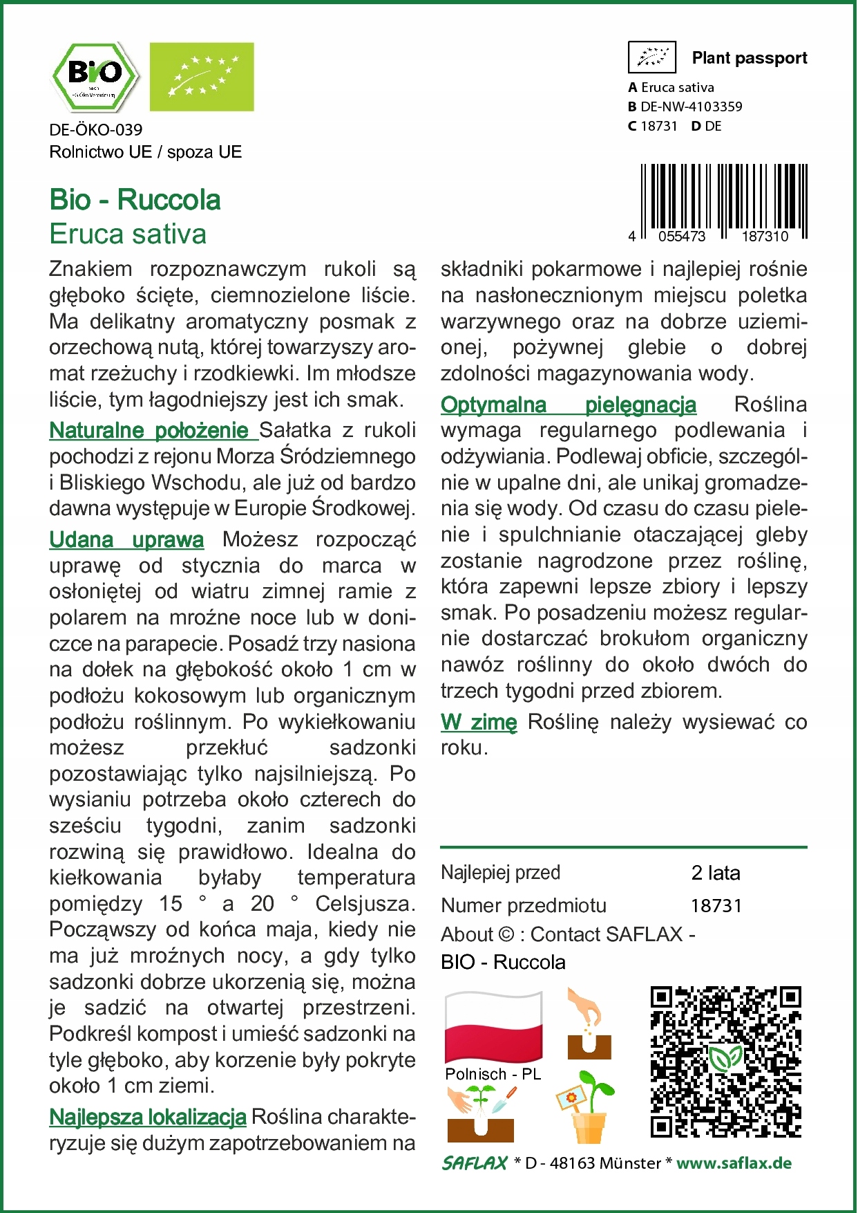 Просматривая «Saflax - ракета - 3000 семян - Euca», вы можете быть уверены, что данный товар из каталога «[rubrica_name]» будет доставлен из Польши и проверен на целостность. В цене товара, указанной на сайте, учтена доставка из Польши. Внимание!!! Товары для Евросоюза, согласно законодательству стран Евросоюза, могут отличаться упаковкой или наполнением.