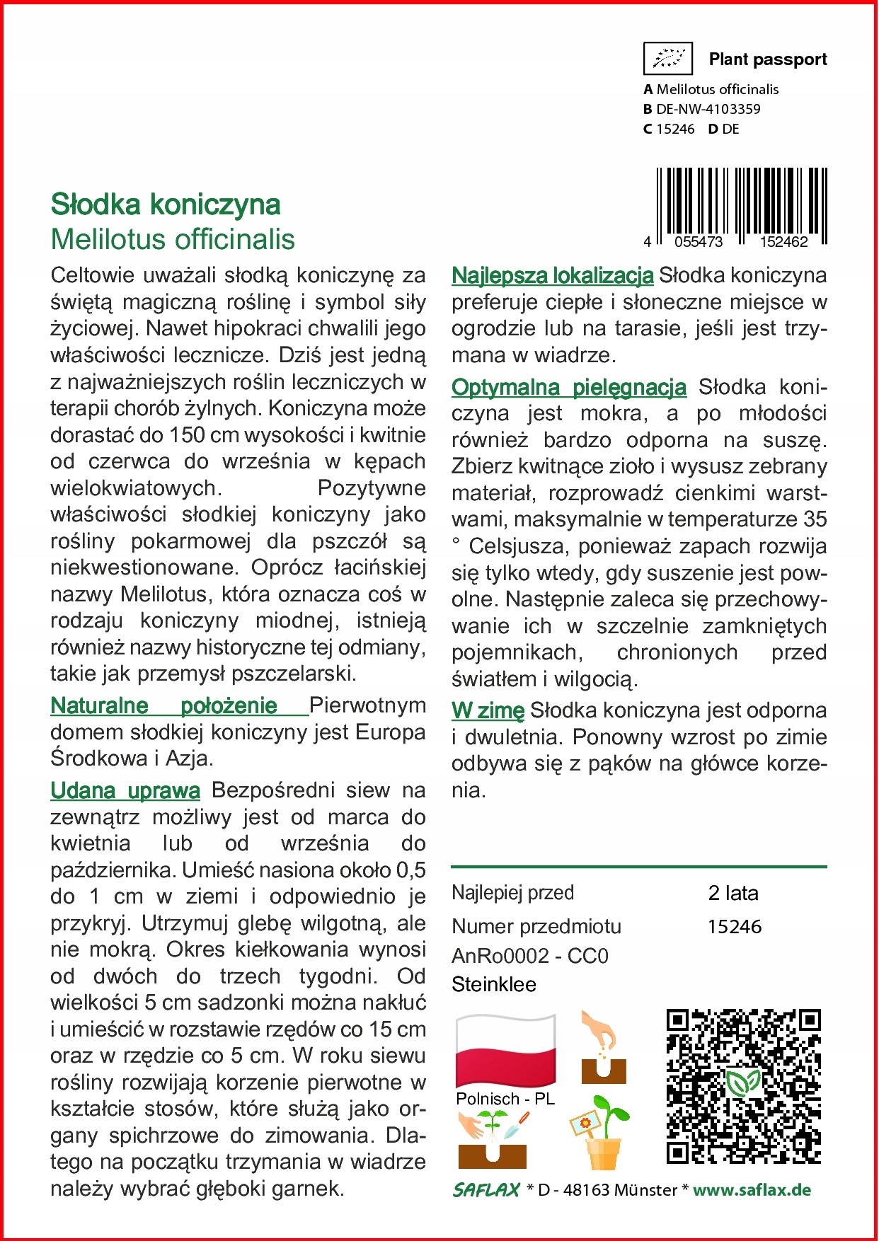 Оплачивая «Saflax - Sweet Clover - 250 семян - Melilotus», вы можете быть уверены, что данное изделие из каталога «Остальные» будет доставлено из Польши и проверено на целостность. В цене товара, указанной на сайте, учтена доставка из Польши. Внимание!!! Товары для Евросоюза, согласно законодательству стран Евросоюза, могут отличаться упаковкой или наполнением.