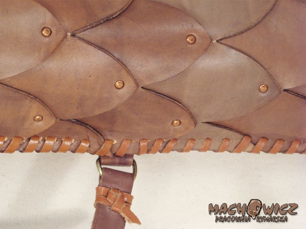 Сагайдак виготовлений з жорсткої чистої шкіри товщиною 2,5 - 3 мм. Передня частина сагайдака виконана з шкіряних нашивок, що імітують «соснову шишку», додатково укріплена декоративними мідними заклепками. Верх і низ посилені подвійною шкірою. Вся річ зшита вручну зі шкіряними ремінцями. Плечовий ремінь гладкий, кріпиться декоративною тасьмою.