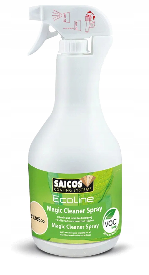 Використовується SAICOS Ecoline Magic Cleaner Spray без розчинників для інтенсивного чищення та догляду за пробковими та дерев’яними поверхнями з вощеним, промасленим або лакованим покриттям.