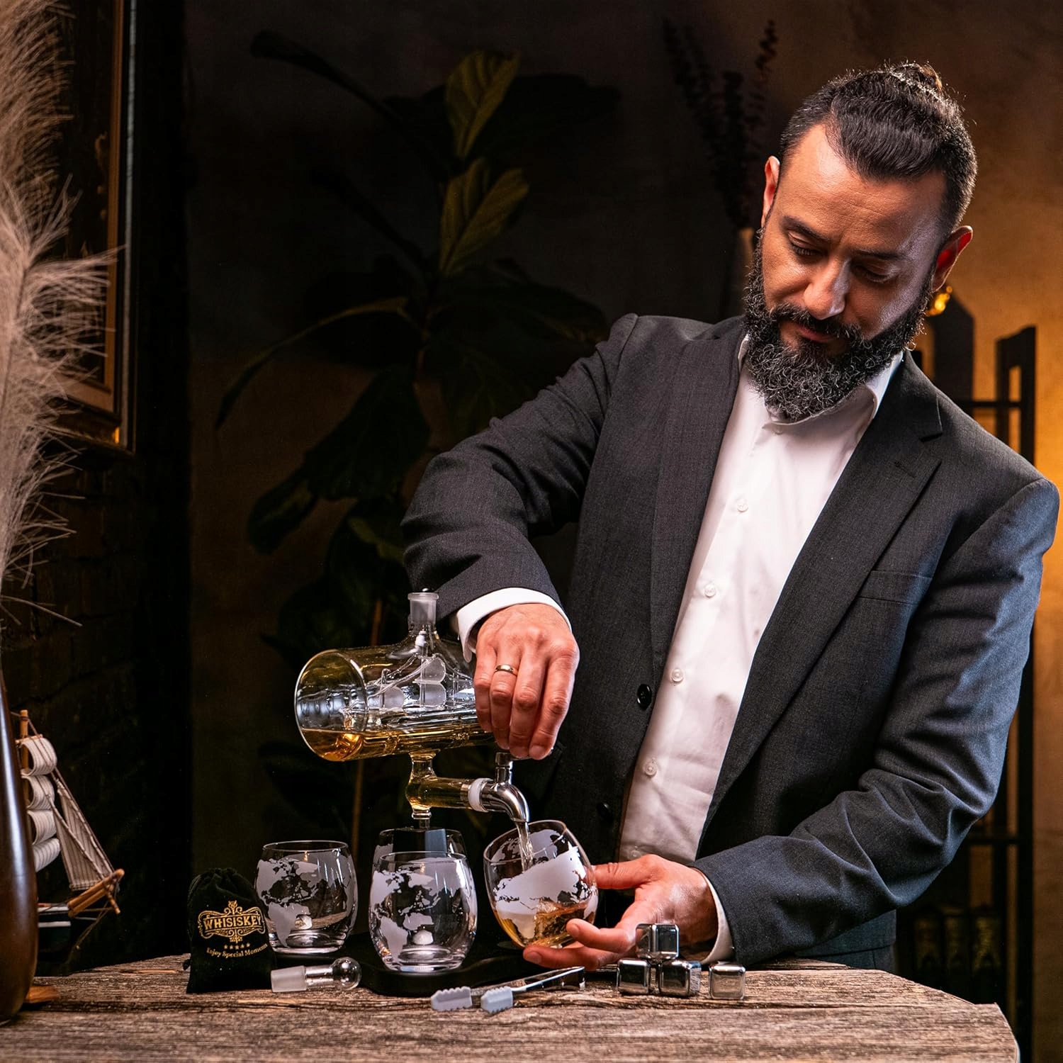 - В набір входить: графин у формі вітрильника, розкішна підставка, 4 склянки, 4 охолоджувальні камені, щипці, рукав, пробка, кран, оксамитовий пакет, подарункова коробка