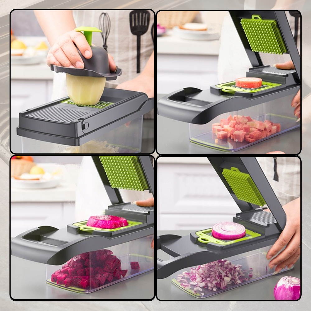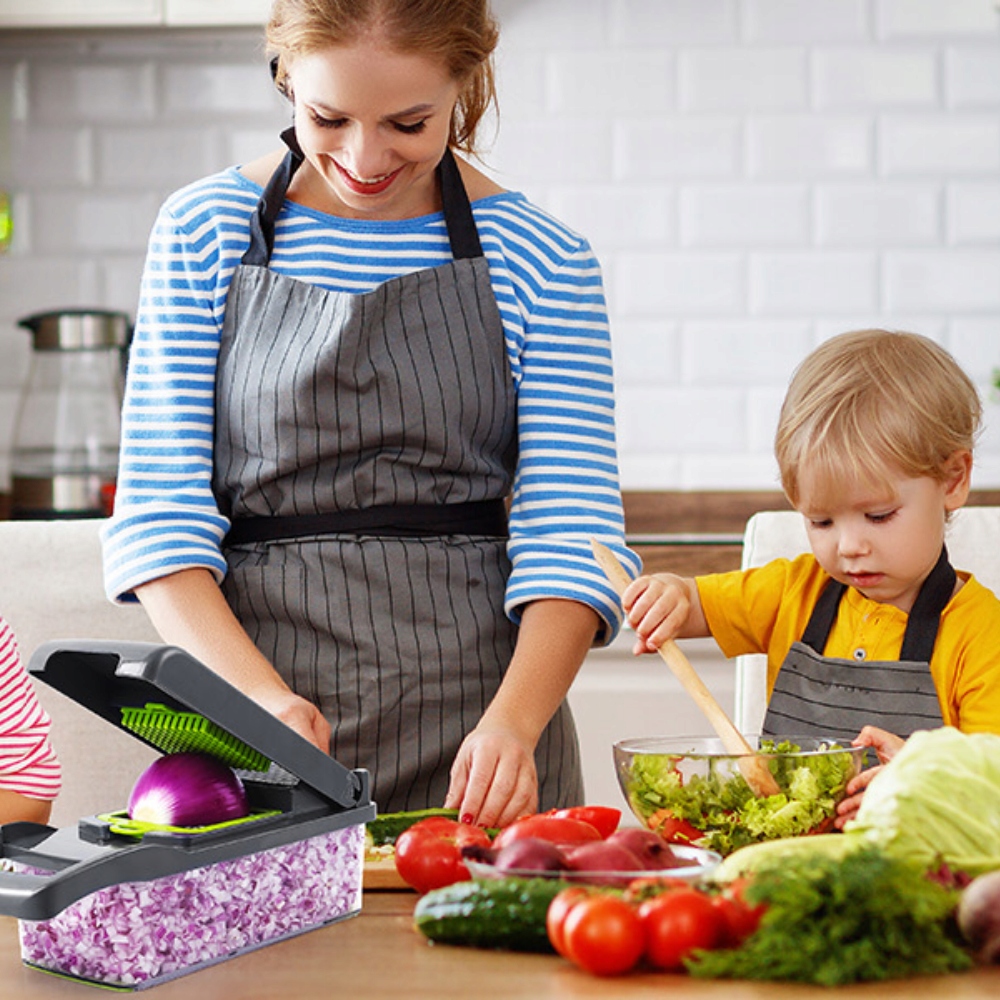 Готуйте страви швидше та зручніше, ніж будь-коли! Слайсер 16 в 1 - практичний кухонний інструмент, який замінить кілька приладів в одному. Він нарізає, шинкує, натирає на тертці, кубиками, скибочками та смажить – усе за кілька секунд.