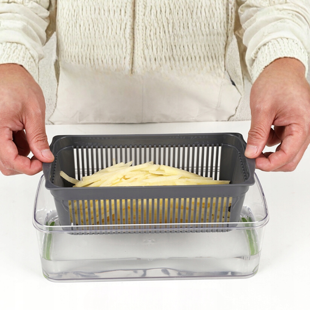 Один слайсер - багато можливостей! У наборі багато змінних наконечників і лез, які дозволяють нарізати різними способами: скибочками, кубиками, паличками, тонкою картоплею фрі або терти овочі в салат.