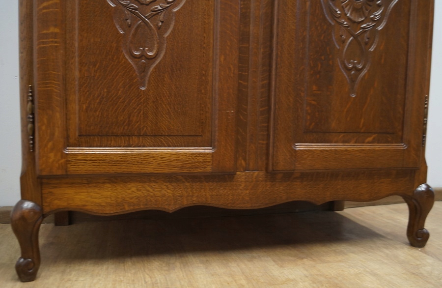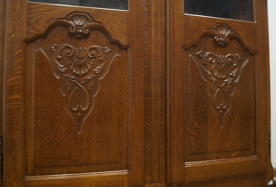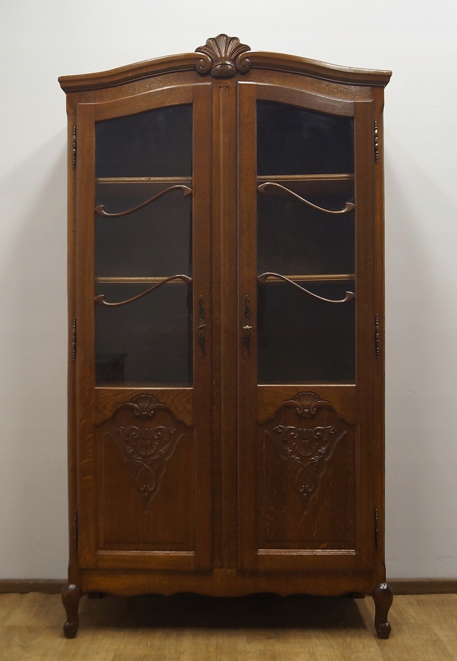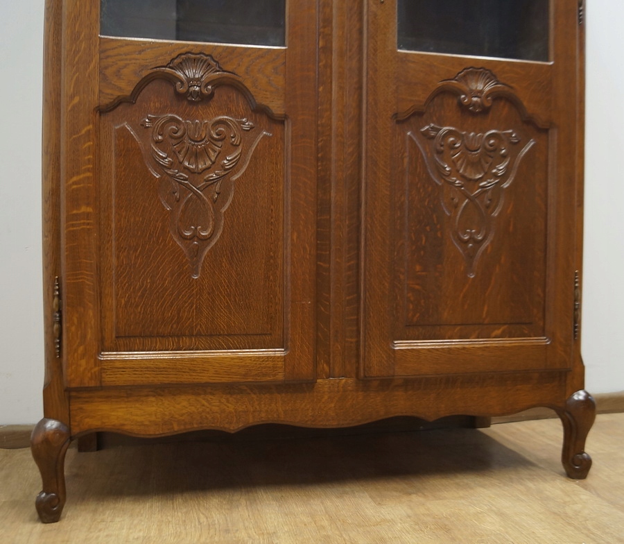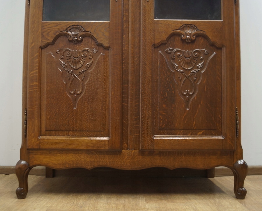 Дві двері засклені зверху, вікна прикрашені мунтами, арочне верхнє завершення різьбленою раковиною. Вітрина прикрашена чудовим різьбленням і спирається на красиві ніжки кабріоля. Низ оброблений декоративним воланом. Красиві різьблені елементи роблять цей предмет меблів унікальним та особливим.