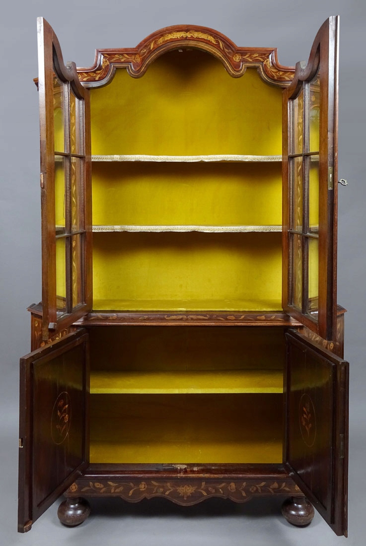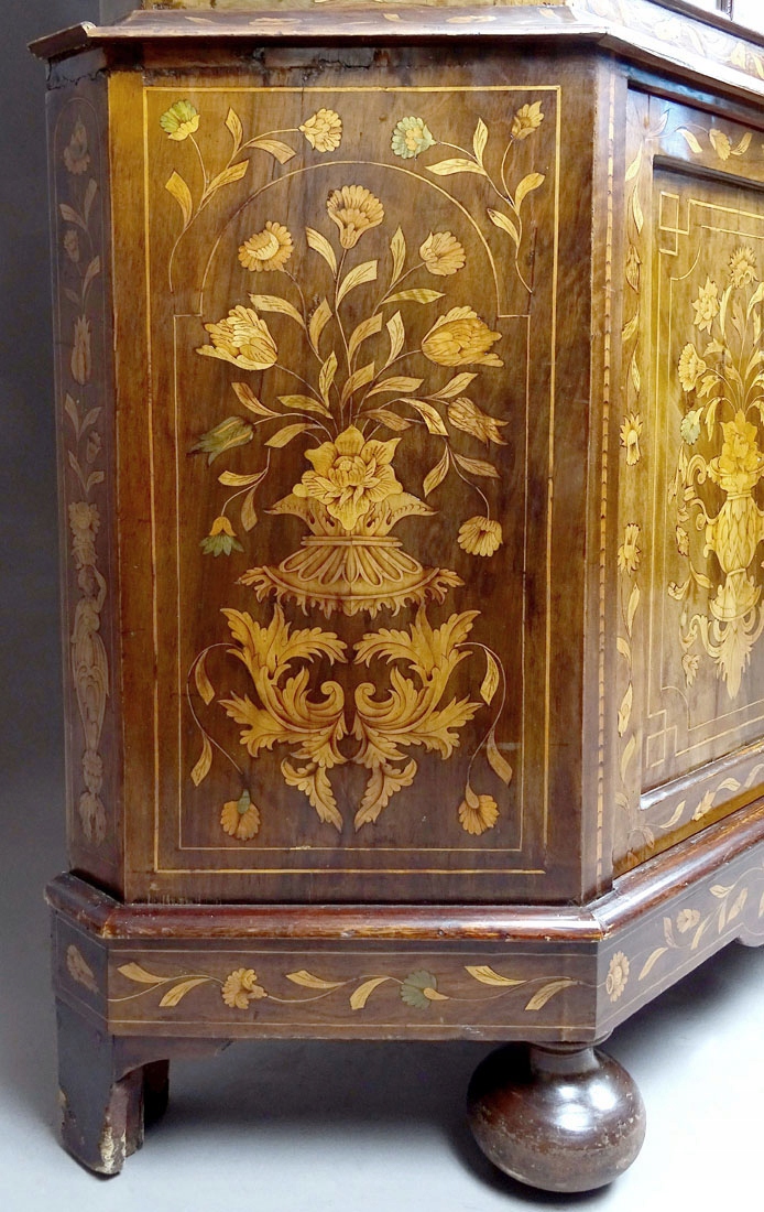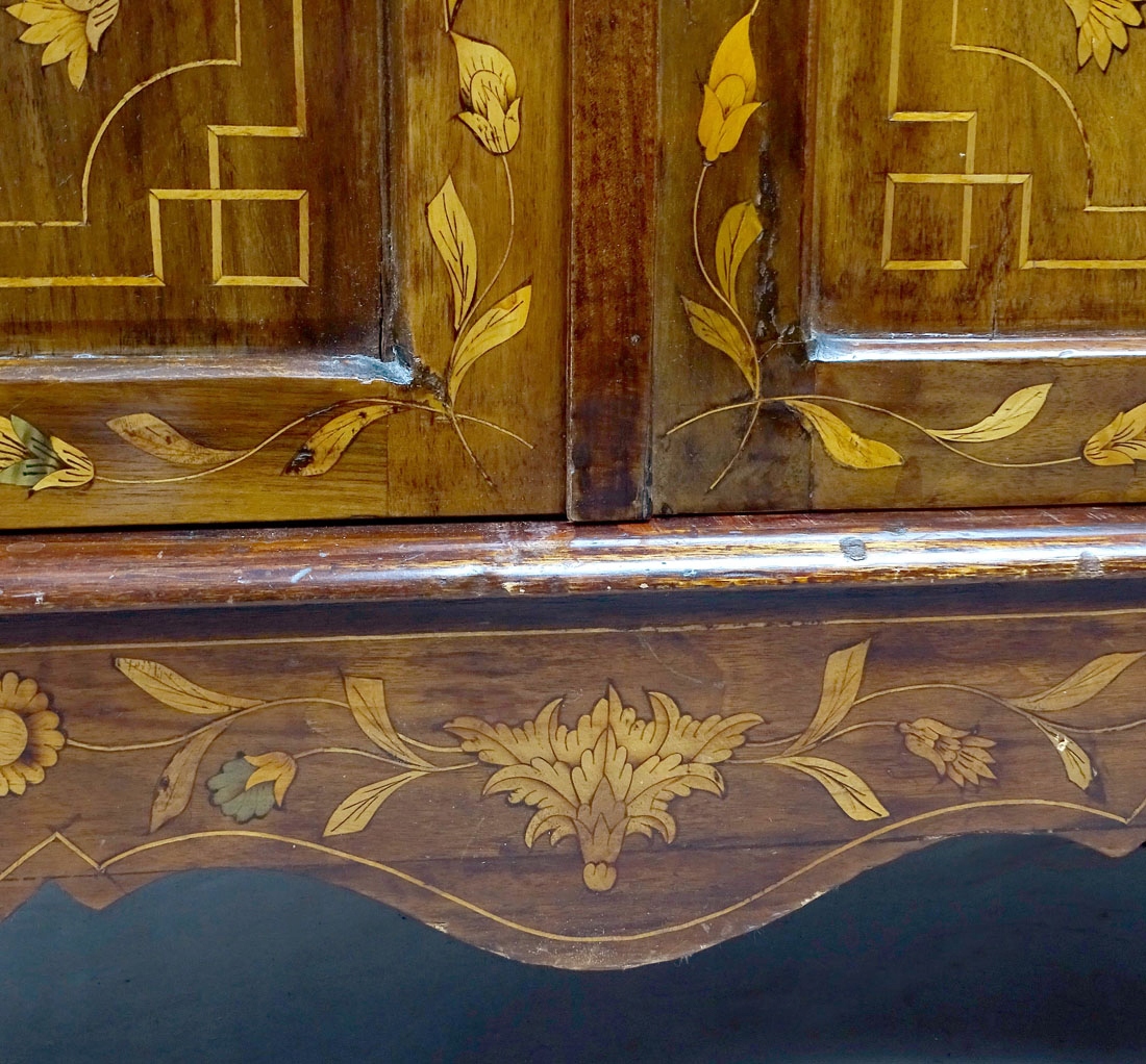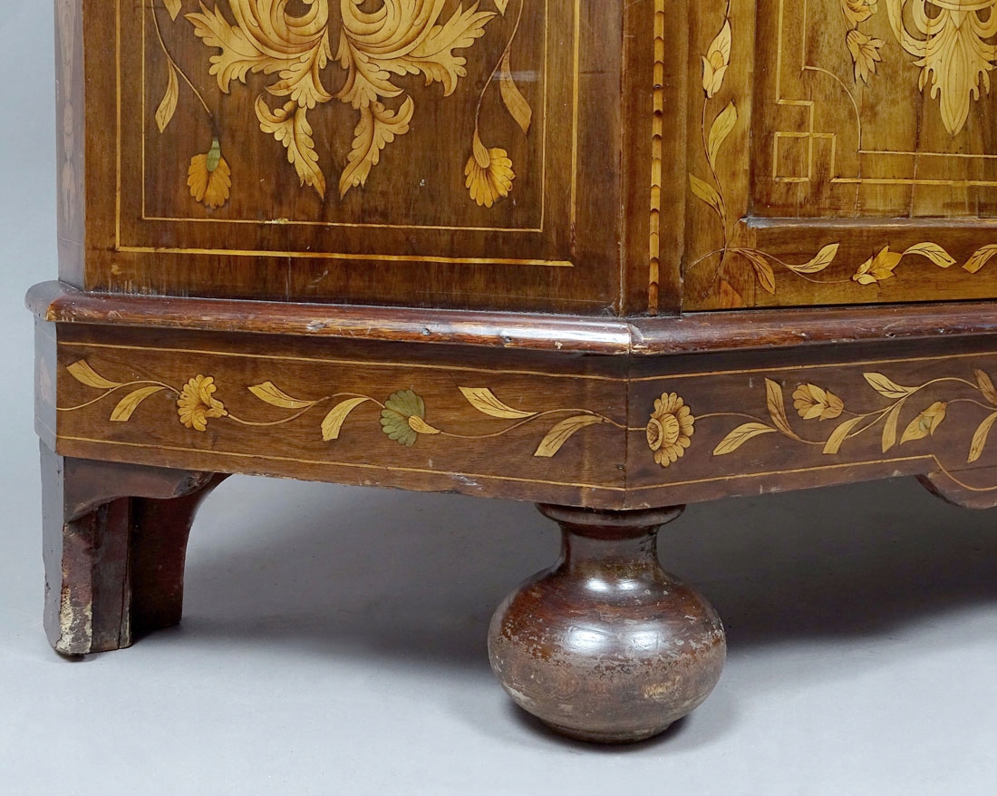 засклений з трьох боків і закрив пару дверей внизу, підтримується на чотирьох ногах, спереду у вигляді сплющених кульок, заднього хребта, що є розширенням структури меблів. Весь дуже багатий інфікований різними видами деревини дуже високої якості, зображуючи квіти, рослинні джгутики та гірлянди. З боків і дверей нижньої частини меблів, інтар у вигляді ваз з букетами квітів. Постановка з хвилястою короною та широкою, профільованою смужкою. Ціле закрито парою дверей з тонкими фігнями, в правому крилі заглиблене, сталевим замком з ключем, а також. Всередині обстановки два дерев’яні полиці, вистелені матеріалом, як і задня частина меблів. Основа з однією полицею всередині, також покрита матеріалом спиною.