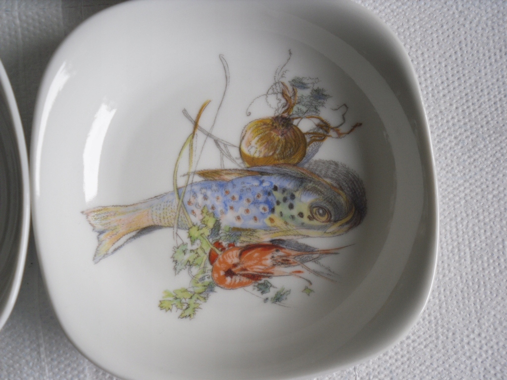 Ласкаво просимо на мій аукціон. На аукціонах я зазвичай пропоную вам предмети з періоду PRL. На цьому аукціоні я пропоную чотири тарілки для салатів з приємними візерунками всередині. Салатні миски для прикраси або порції. Прекрасний стан. Підписав Ріб Баварія. Дуже хороший стан, без пошкоджень, ніжні подряпини або знебарвлення, тарілка з мотивом креветок посередині злегка шорсткою. Див. Фотографії