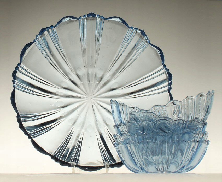 Салатниці (1 велика та 5 маленьких) з синього пресованого скла. Вони походять із домашнього скляного заводу «Ząbkowice» у Домброві-Гурнічі. Каталожний номер 1085. 1960-1970-ті роки.