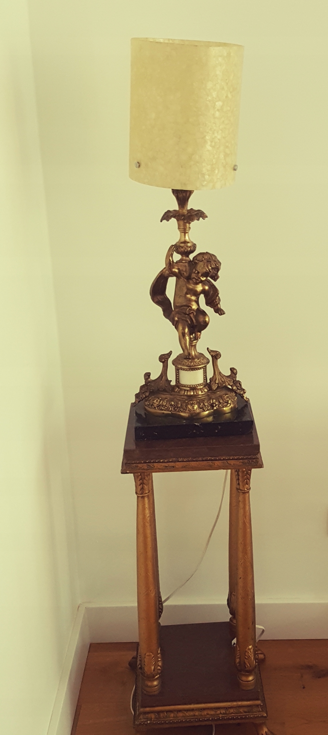 Зі смаком вишуканий елегантний світильник для вітальні/офісу - зроблено - підстава та елементи з латуні/бронзи, прикрашені зовні абажуром у вигляді Купідона, ретельно виконана обробка створює надзвичайно декоративний ефект. Дуже хороший стан - без пошкоджень - I рекомендую!!! на жаль, фотографії низької якості не відображають чарівності цієї прекрасної лампи.