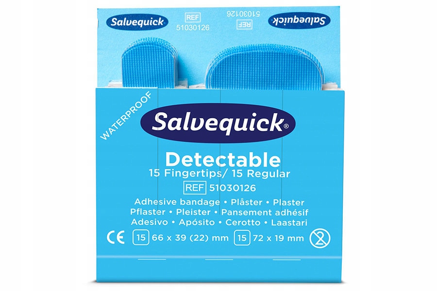 Пластирі Salvequick Cederroth REF 51030126 blue detective — це високоякісні гнучкі та самоклеючі пластирі, упаковані в блістер по 30 штук у двох розмірах, який адаптований до спеціальних машин Salvequick REF 490700 Головною особливістю, яка відрізняє цей продукт від традиційних пластирів, є спосіб дозування - просто витягніть пластир з блістера однією рукою і відразу ж приклеюйте його до рани. Сині плями виявляються металодетекторами та добре помітні, тому вони призначені для харчової промисловості та громадського харчування.