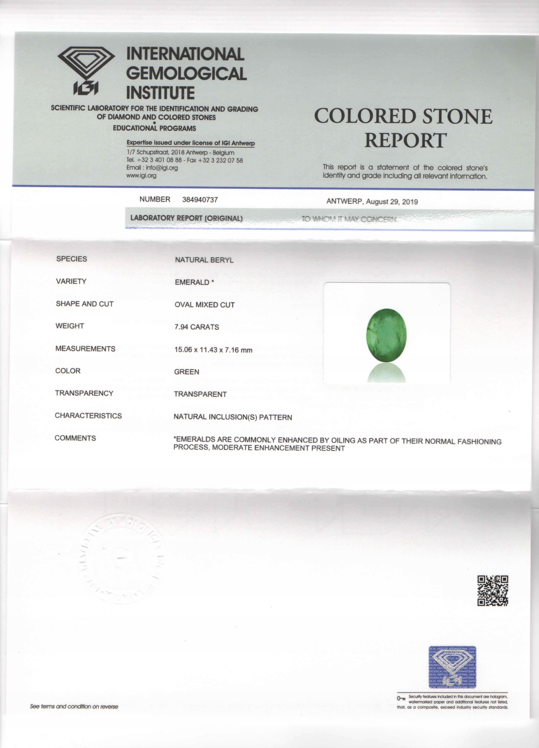 SAMBIA EMERALD натуральний сертифікат IGI 7,94 ct