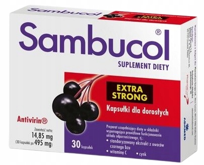 SAMBUCOL EXTRA STRONG - це дієтична добавка, яка поєднує в собі дію ягід бузини, вітаміну С і цинку. Призначений для дорослих для підтримки імунітету організму.