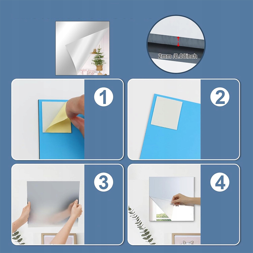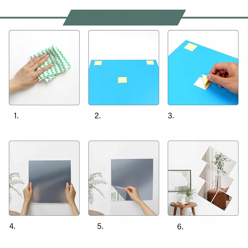 <Само -адгезійна конструкція проста у використанні, приклеїмо їх на гладку та чисту поверхню, відриває захисну плівку на поверхні дзеркала, і ви можете її використовувати.✔ Це може допомогти збільшити відчуття простору в кімнаті та полегшити кімнату дзеркальним відбиттям.