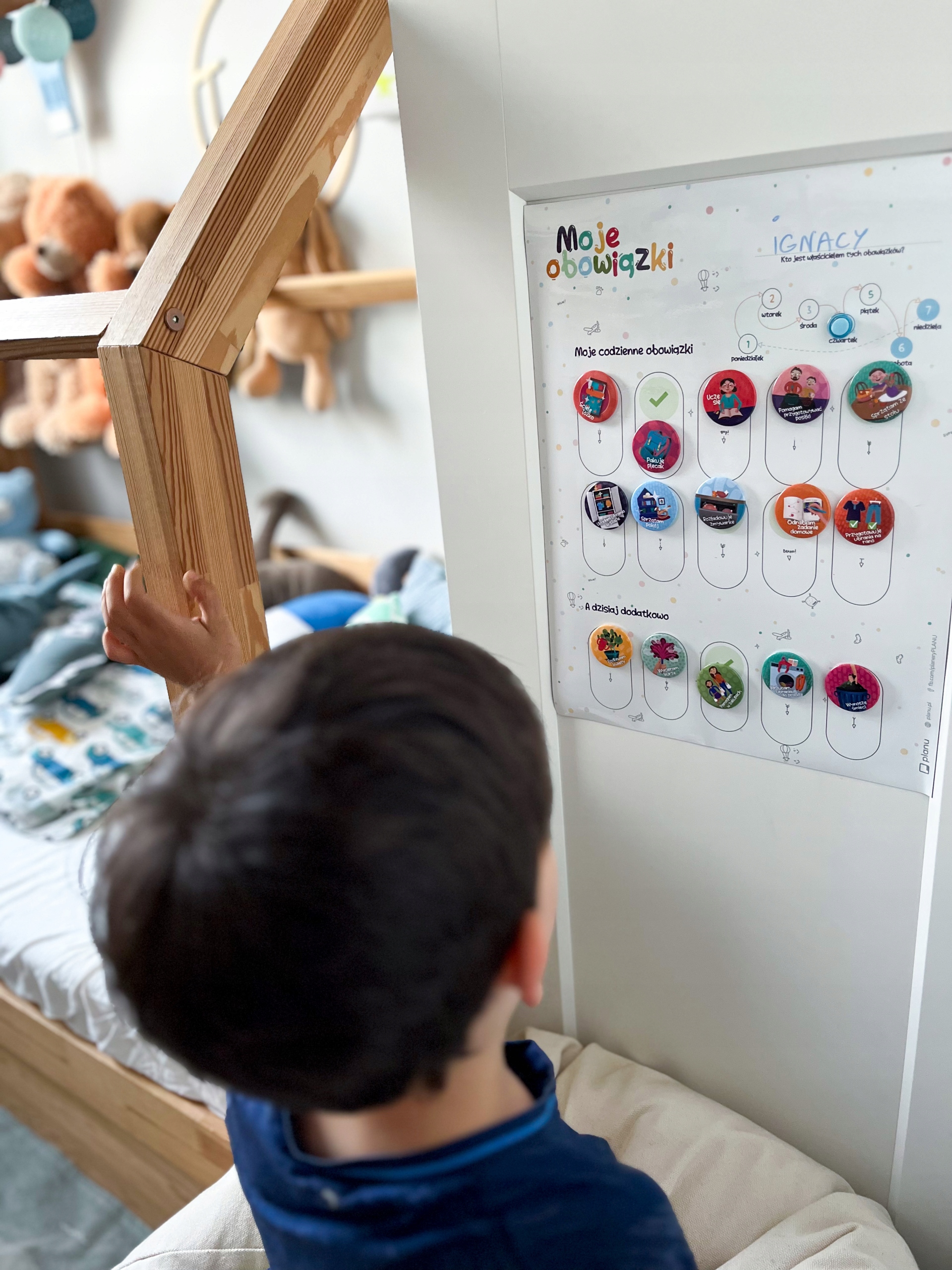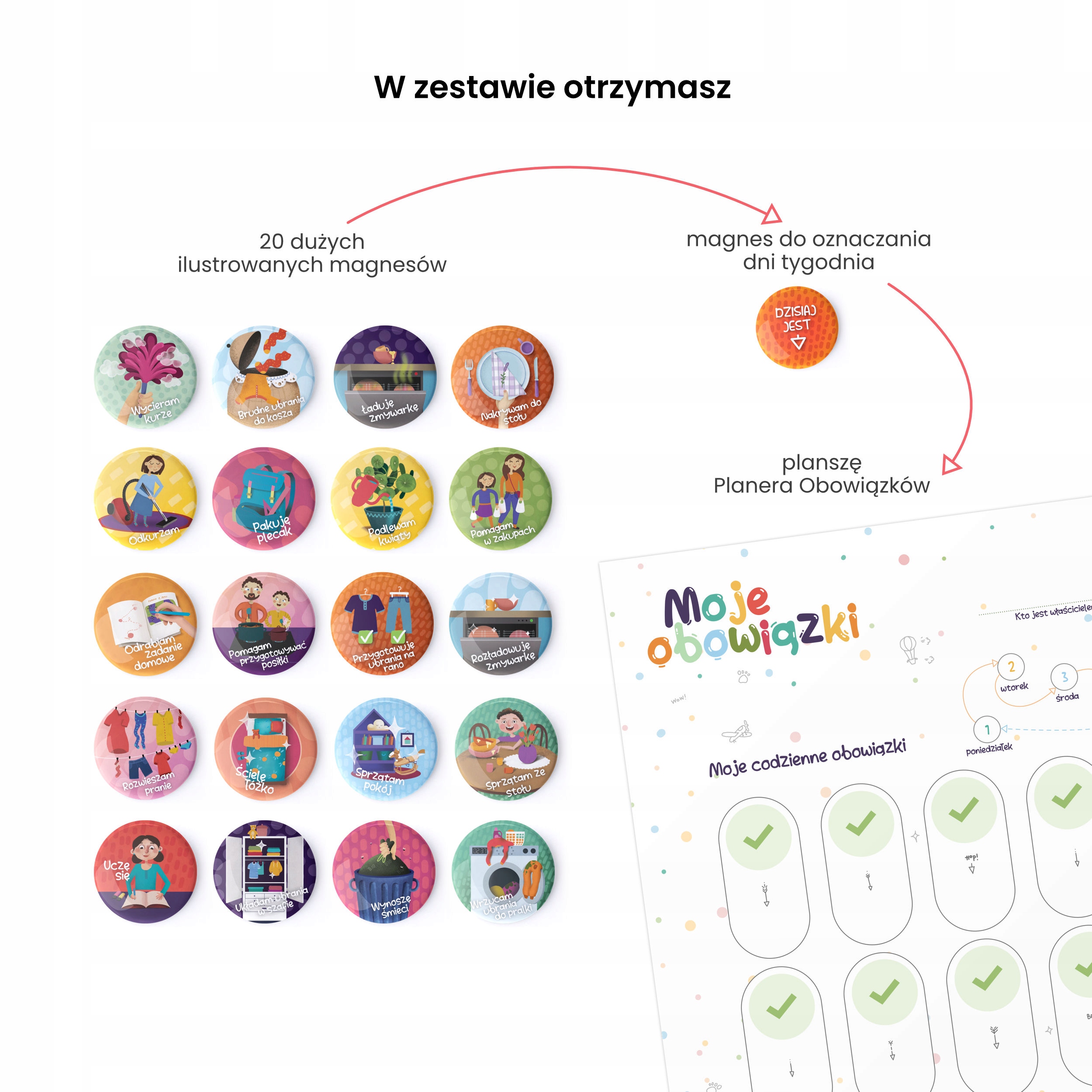 - У наборі ви отримаєте планер обов'язків, 20 магнітів з обов'язками та магнітом для відзначення дня тижня .