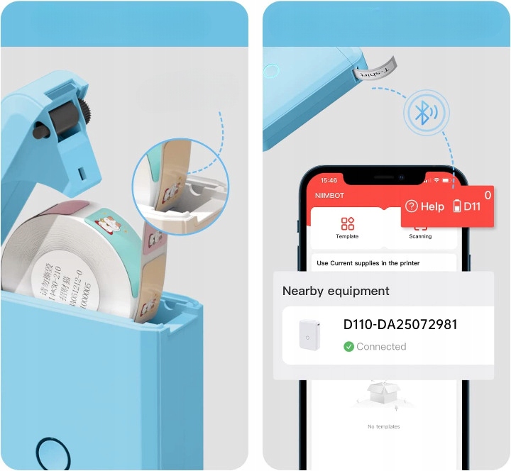 Принтер мітки підключається до вашого телефону за допомогою Bluetooth. Просто завантажте безкоштовну програму Niimbot з AppStore або Google Play, увімкніть Bluetooth на своєму телефоні та підключіться за допомогою однієї кнопки з пристроєм D110.