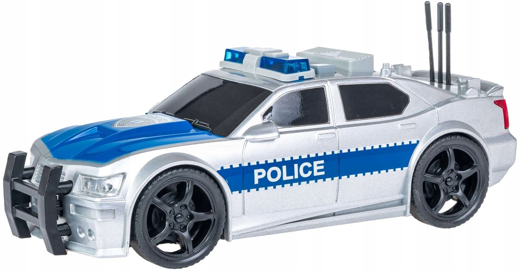 поліцейський автомобіль має срібне тіло з білими та синіми елементами. У ньому є 4 пластикові колеса, які дозволяють йому рухатися на різних поверхнях. Транспортний засіб обладнаний, відкритий кнопкою, багажником та звуковими та легкими ефектами, завдяки якому він нагадує справжній поліцейський транспортний засіб.