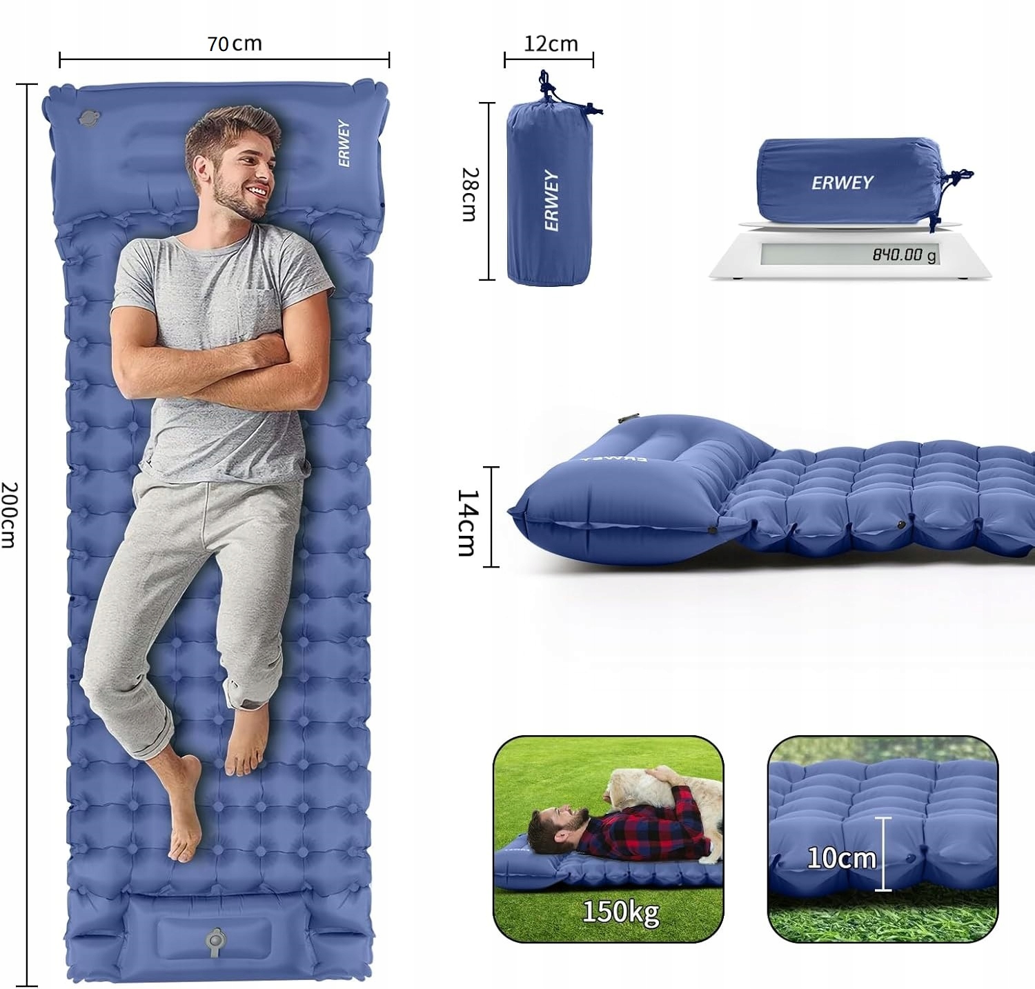 сплячий килимок, надувний розмір розширення 200 х 70 х 10 см, висота подушки: 14 см, розмір сумки для зберігання: 28 х 12 х 12 см; Навантаження може досягти 150 кг. Зменшіть навантаження і легко подорожуйте, щоб ви могли продовжувати і насолоджуватися задоволенням. Підходить для сплячого килима, сплячих килимків для рюкзака, спальних килимів, спальних килимів. Такого ж розміру і ваги, що і невелика пляшка з водою, вона ідеально вписується в рюкзак або валізу, що робить його найбільш міцним обладнанням для кемпінгу.