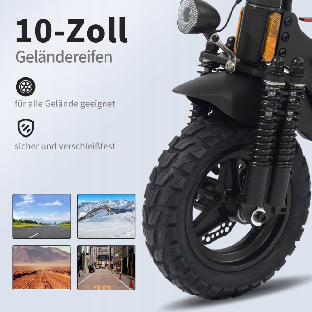 10-дюймові всюдихідні шини та подвійна підвіска: широкі 10-дюймові нековзкі шини забезпечують чудове зчеплення та стабільність на різноманітних поверхнях. Крім того, передні та задні амортизатори забезпечують плавну та комфортну їзду навіть на вибоїстих дорогах або вулицях з бруківкою.