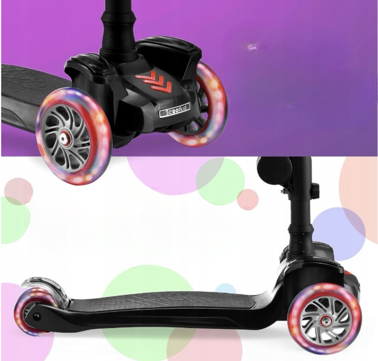 ➡️ БАГАТОКОЛЬОРОВІ ЛІХТІВКИ ДЛЯ КІЛЬС: Насолоджуйтеся враженнями від наших 3-колісних дитячих самокатів із яскравими світлодіодними ліхтарями на кермах. Індикатори змінюють кольори, завдяки чому ваш самокат виділятиметься, куди б ви не пішли.