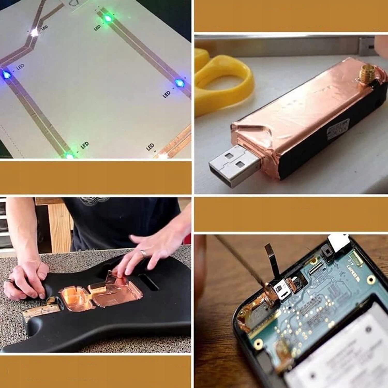 - Захистіть свої пристрої від електромагнітних і радіочастотних перешкод. Від гудіння гітар до комп’ютерних кабелів – мідна стрічка пропонує швидке та просте рішення. Клей є міцним, гнучким і електропровідним, що дозволяє легко захистити електроніку