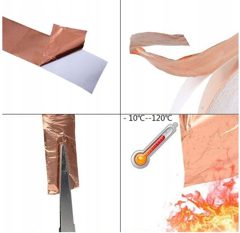 - ✔️EMI екранування: якщо ви хочете захистити своє технічне обладнання від електромагнітних перешкод, від дзижчання гітар до комп’ютерних кабелів, мідна стрічка є швидким і простим рішенням.