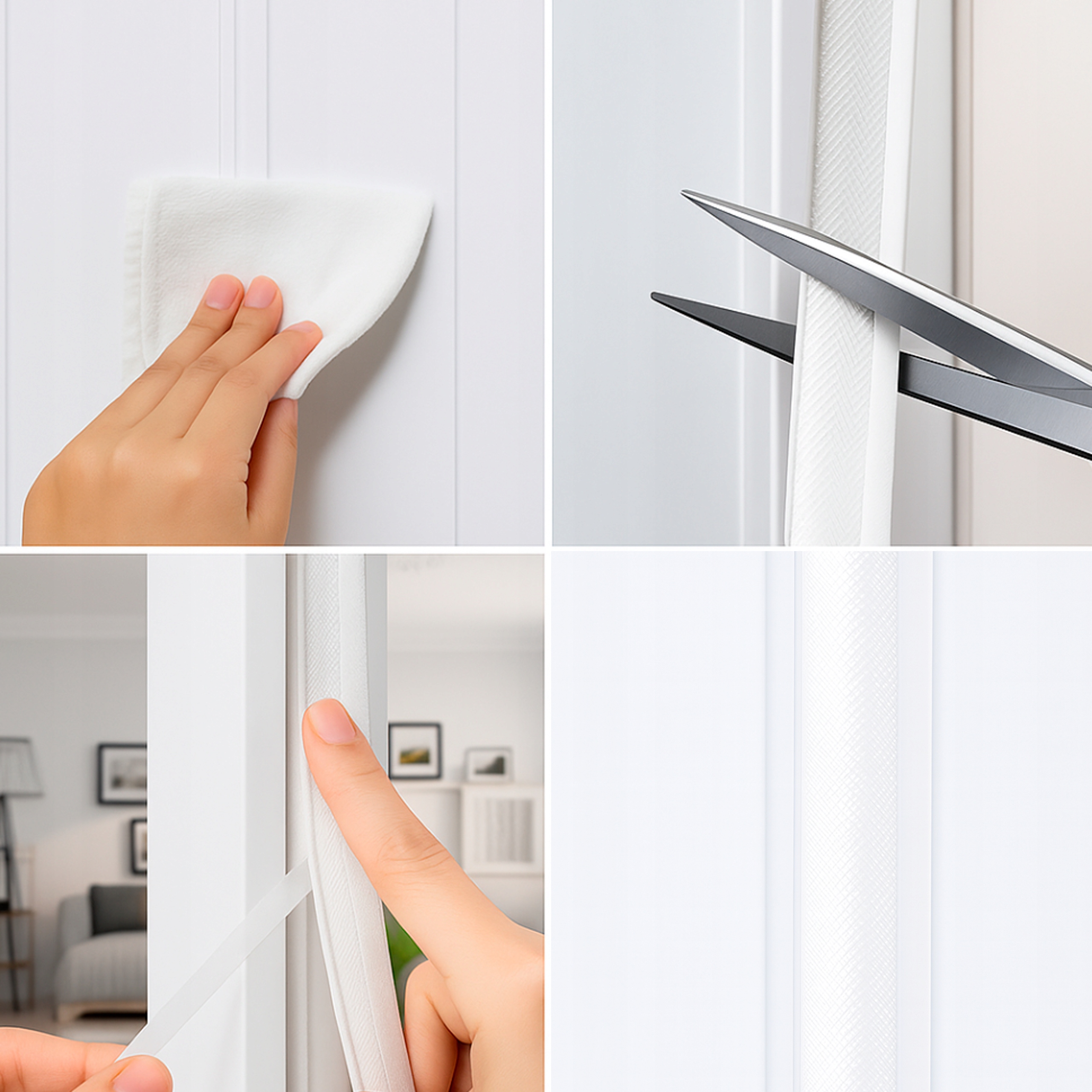 4️⃣ ПРИКРІПЛІТЬ ПРОКЛАДКУ – розташуйте ущільнювач на дверній рамі, вікні чи іншій поверхні. Притисніть рівномірно по всій довжині, щоб клей добре склеївся.