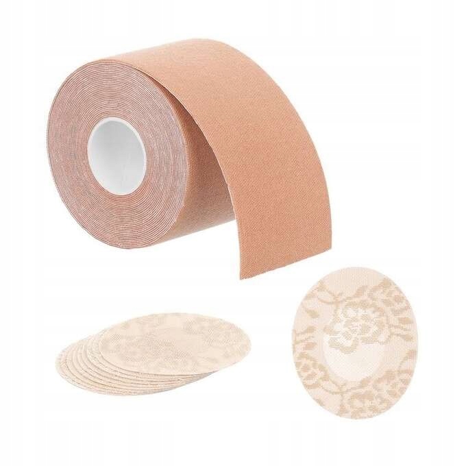 Breast Tape виготовлено з безпечних для шкіри матеріалів. Переважає приємний на дотик дихаючий нейлон, а домішка спандексу надає еластичності. Завдяки водонепроникним властивостям клею аплікація тримається довго і стійка до води та поту. У набір входять мереживні накладки на соски, які підвищують комфорт і захищають чутливу шкіру сосків. Постуки практично непомітні, не сковують рухів і не викликають роздратування. 5-метрового рулону вистачає для багатьох застосувань, а завдяки бежевому кольору стрічка тане на шкірі і стає майже непомітною.