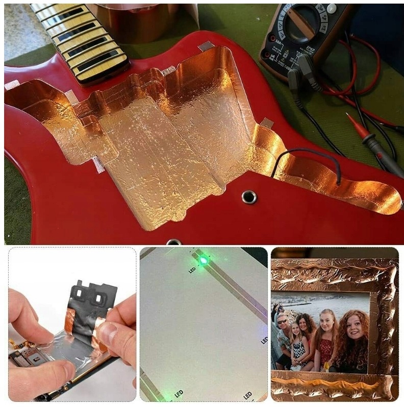 Фольгова стрічка EMI Ви можете використовувати її для своїх виробничих проектів, якщо вам потрібно трохи попотіти. Його також можна використовувати на картках і дуже легко вставити за допомогою окремої провідної клейкої бічної смужки.