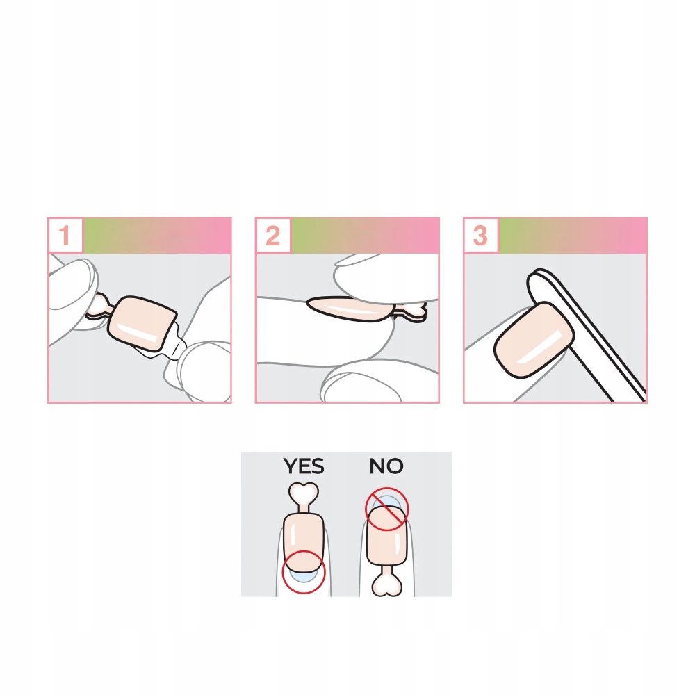 Очистіть натуральну нігтьову пластину за допомогою Prep Pad. Виберіть відповідний розмір нігтя, зніміть захисний шар, помістіть його на натуральний ніготь і притисніть. Після нанесення видаліть вкладку та підпиліть наконечник.
