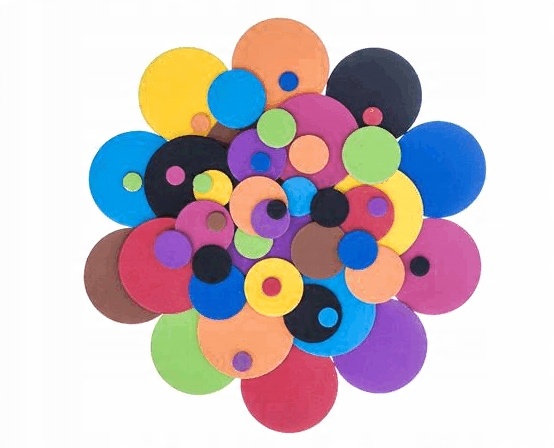 Набір круглих пінопластових наклейок різних розмірів і кольорів.