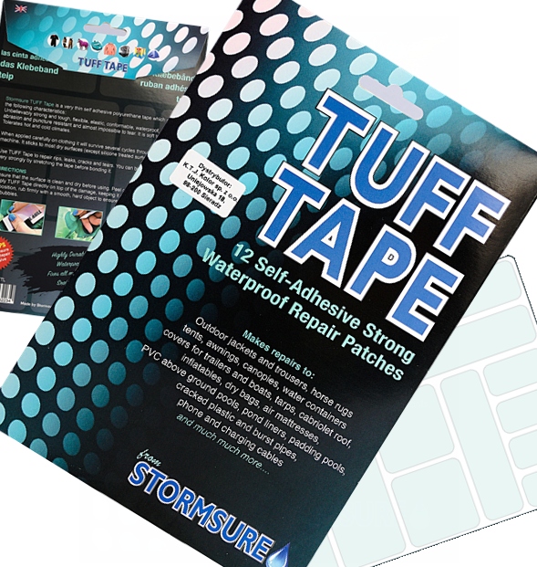 Stormsure "TUFF TAPE" - це серія спеціальних самоклеючих пластирів в різних формах і розмірах. Вони характеризуються дуже міцною, прозорою, водонепроникною структурою матеріалу. Вони мають подібний склад до клею Stormsure, тому мають багато спільних рис, таких як гнучкість і довговічність.