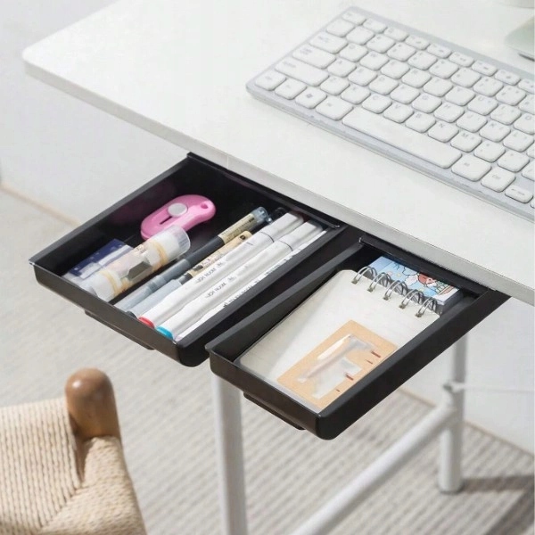 Самоклейна шухляда — ідеальний підстільний органайзер, який заощадить місце на вашому столі. Ящик дозволить вам легко розмістити канцелярське приладдя, телефон, ключі, зарядні пристрої, ручки та інші дрібниці.