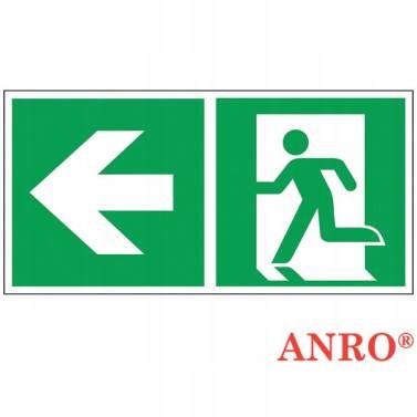 Знак, що вказує напрямок евакуації. Комбінований знак - містить піктограми "евакуаційний вихід" ліворуч та стрілку ліворуч. Вивіска має сертифікат затвердження CNBOP - PIB.