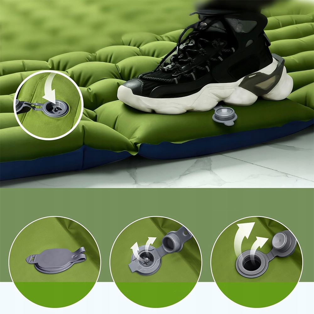 Килимок для сну на відкритому повітрі можна надути повітрям, стоячи однією ногою на з’єднанні насоса, що зручно та легко. Швидке спорожнення займає лише 1 секунду та економить сили. Завдяки вдосконаленій версії вентиляційного клапана без плівки, що запобігає протіканню, вам більше не доведеться турбуватися про витік повітря!
