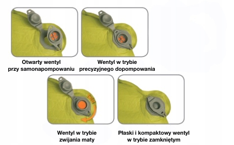 Він забезпечує легке надування килимка та односторонній випуск повітря при складанні (a система, яка запобігає самонадування матраца при складанні). )