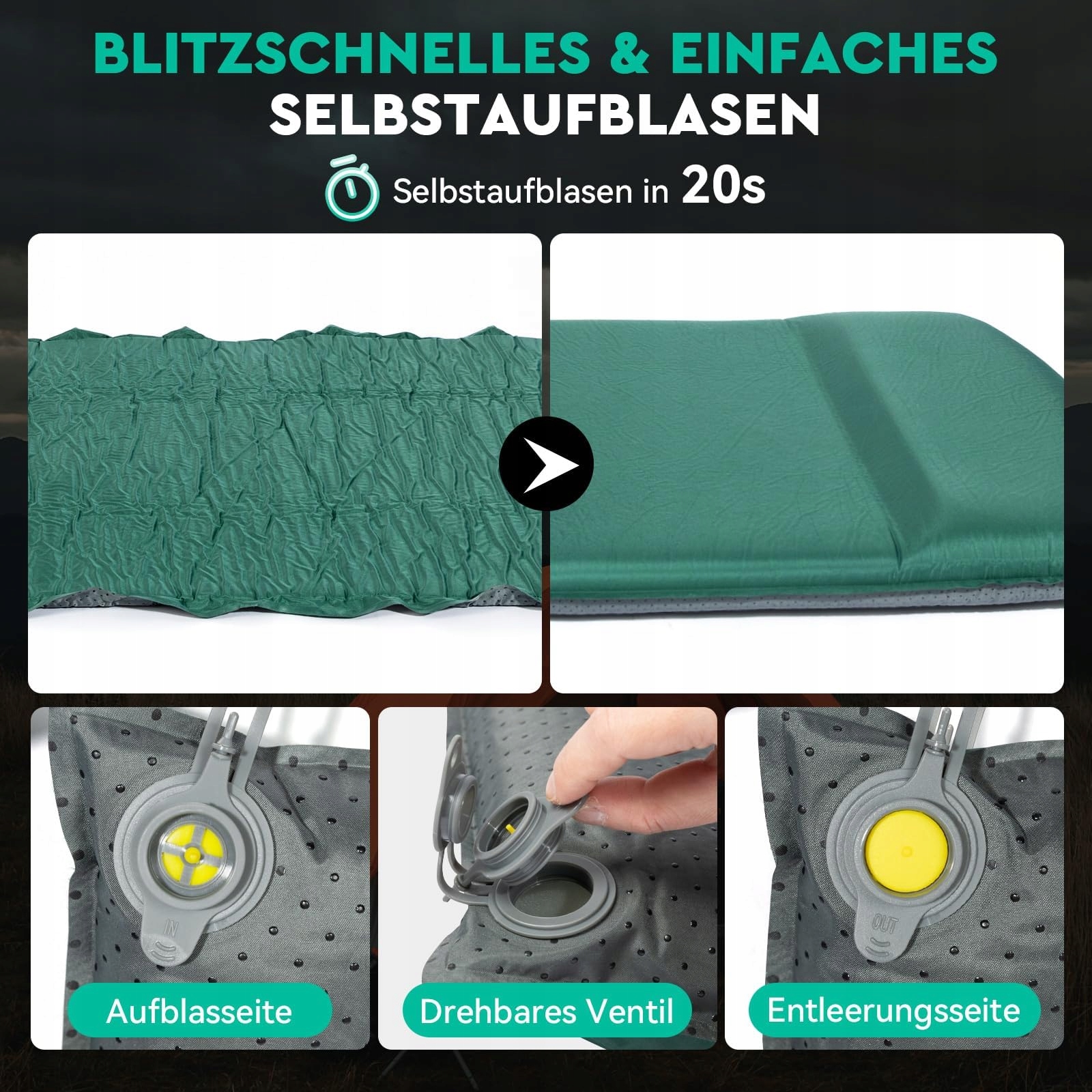 Подвійний клапан дозволяє випускати повітря вдвічі швидше, ніж у стандартних килимках; у згорнутому вигляді набір ремінців і компресійний мішок утримують все це в компактному рулоні. Все це поміщається в бічну кишеню рюкзака, кошик для велосипеда або багажник автомобіля - воно ідеально підійде як легкий кемпінговий килимок, підлога намету або екстрене ліжко для гостей вдома.
