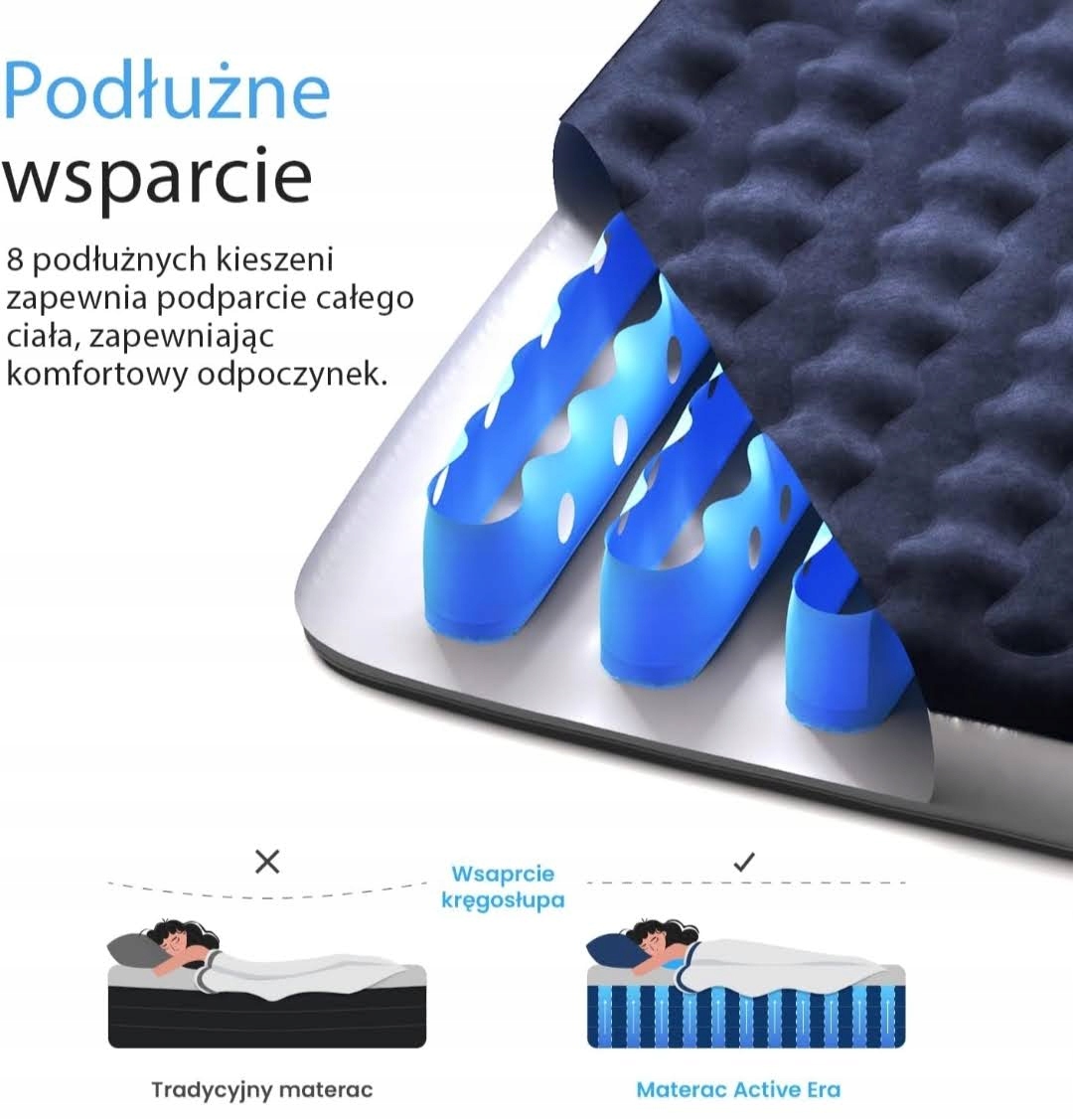 8 подовжених кишень, наповнених повітрям, дозволяють матрацу ідеально адаптуватися до вашого положення, що гарантує стабільну підтримку хребта протягом ночі. Матрац ідеально підходить для двох дорослих або 3-4 дітей.