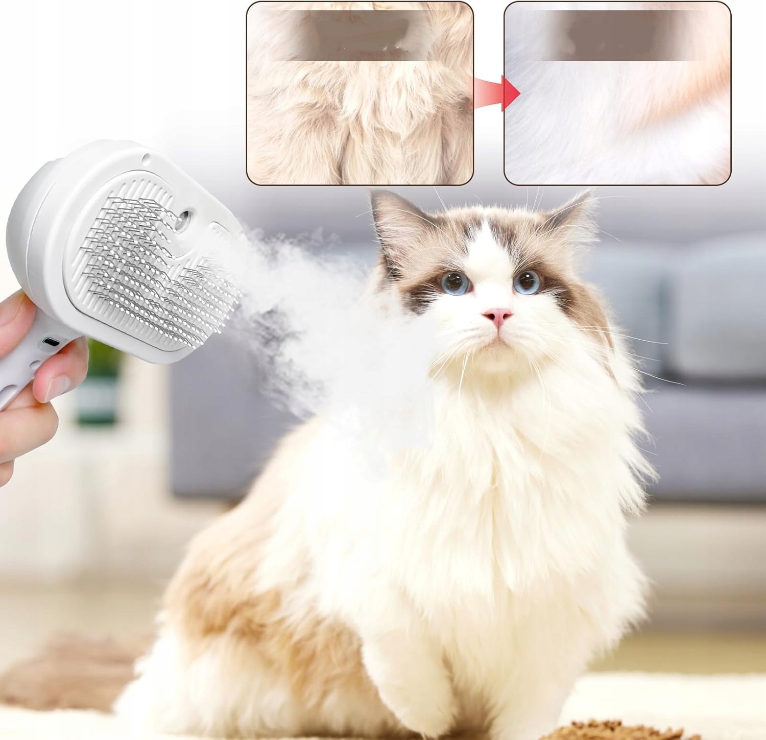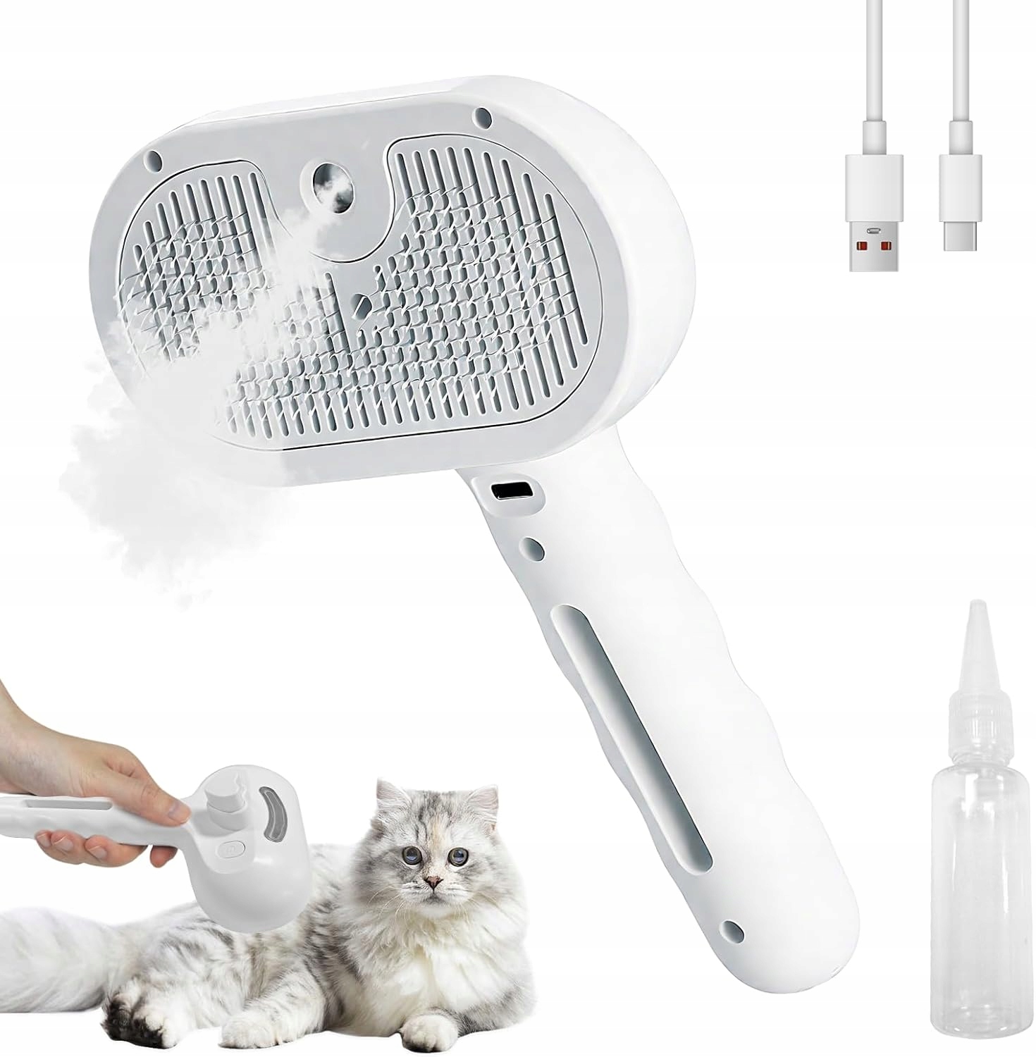 - Парова щітка для собак: рівномірне та м’яке розбризкування збільшує зволоження шерсті та робить збір шерсті більш ефективним, запобігає статичній електриці та розльоту шерсті. Це допомагає мінімізувати проблеми вузлів. Ви можете додати в спрей кондиціонер або пом’якшувач і покращити м’якість і блиск шерсті вашої кішки.