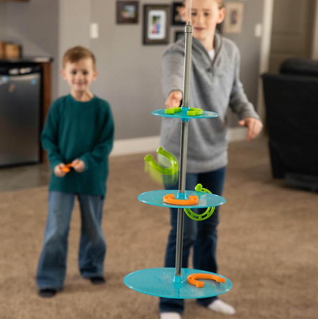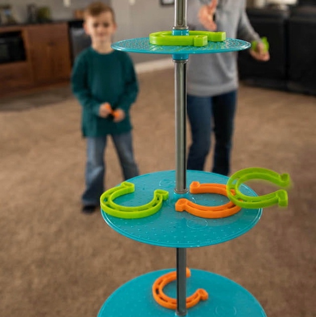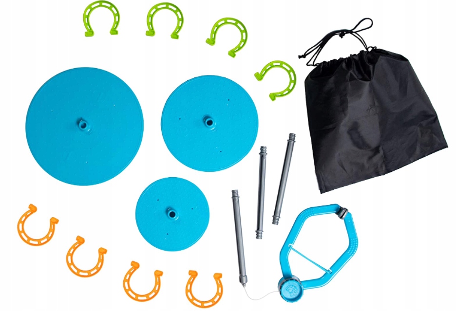 Класична гра в кидання підкови в інноваційній, саморобній, неймовірно захоплюючій версії. Гравці по черзі кидають гуму підкови, щоб вдарити та зачепити їх за підвішені стовпи та платформи.Вам не потрібен сад і гарна погодаабо забивання кіл, щоб грати командою чи індивідуально.