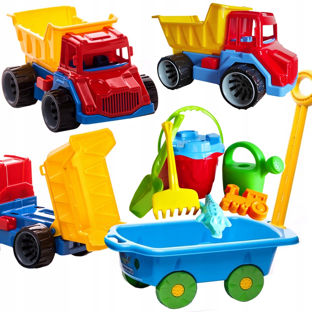Набір: Дуже гарно зроблений вантажівка з піднятою навантажувальною коробкою + автомобілем з ручкою + набором піску (замок, водотоки, ситечка, лопатка, граблі, форми) - польський продукт !!! - Висока якість !!!