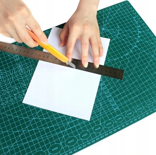 Двосторонній килимок має неслизьку поверхню і ідеально підходить для різання різних видів матеріалів, таких як картон або тканина.