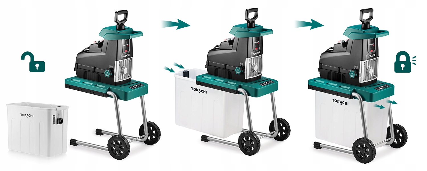 розриваючий подрібнювач з кошиком | Діаметр гілки до 44 мм | зупинена кошик (коробка) з ємністю до 60 л | Макс 3500 Вт | sekator включений власник штовхача | Швидкість обертання 60 об/хв | дуже тихо | Енергетична панель керування Панель захисту від перевантаження Зворотна передача | БЕЗКОШТОВНИЙ ГОЛОВНА | Транспортний власник великих коліс