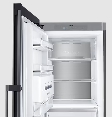 Повна технологія No Frost від Samsung забезпечує постійну циркуляцію прохолодного повітря, систематично видаляючи зайву вологу з всередині холодильника. Завдяки цьому на стінках або продуктах не накопичується лід і іній. Їжа довше залишається свіжою та поживною, а чистити її легше – без розморожування.