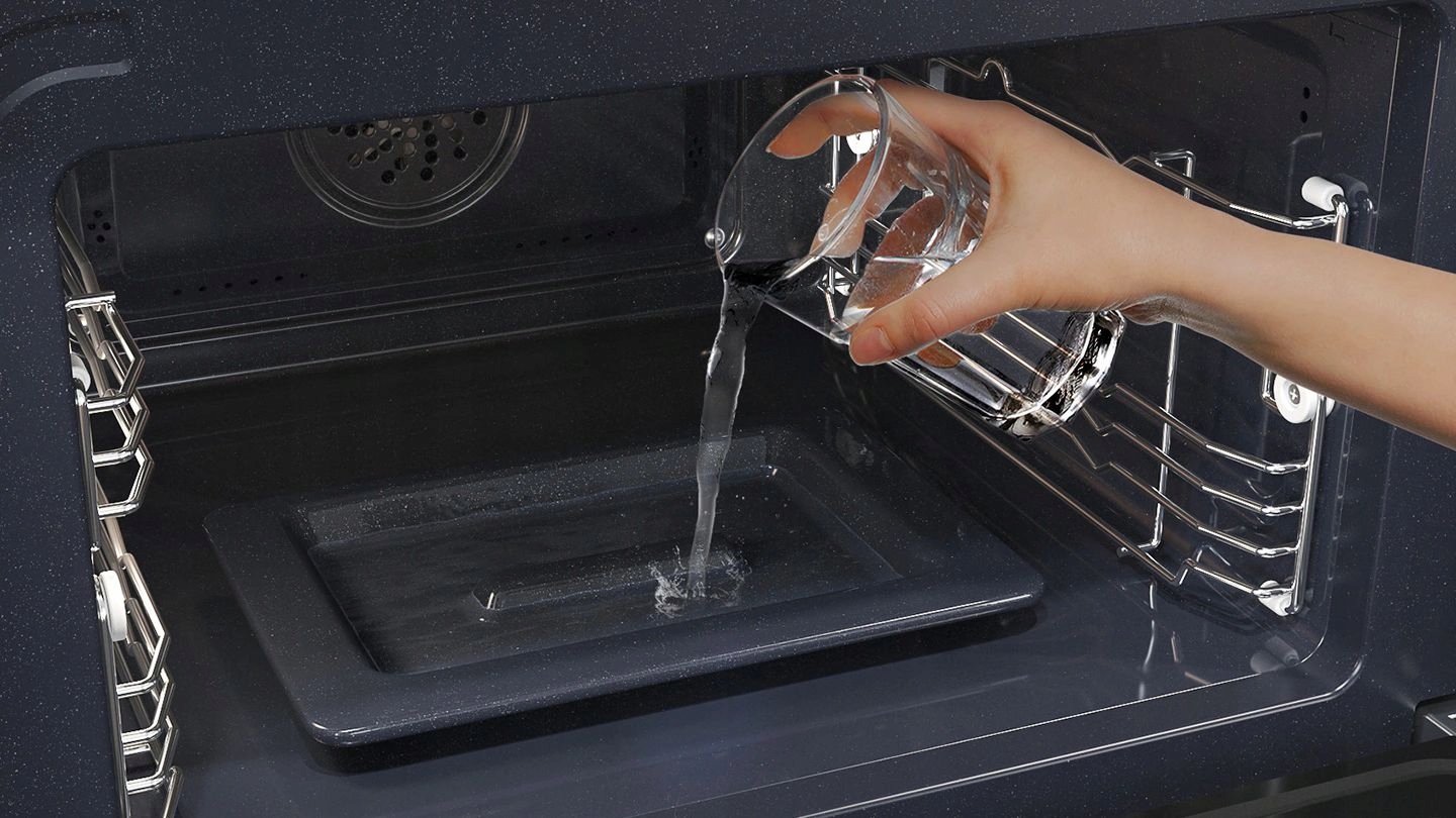 Очищення пари - це швидкий і зручний метод, який не потребує використання миючих засобів. Щоб ефективно очистити духовку, просто налийте трохи води всередину і виберіть функцію очищення пари, яка ефективно розчиняє бруд. Нарешті, бруд можна легко видалити тканиною.