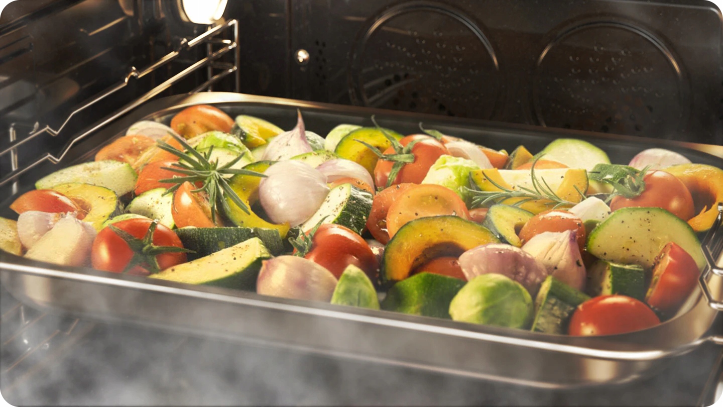 Радість випічки та пропарювання, щоб посуд зберігав свою соковитість. Dual Cook Steam ™ дозволяє приготувати здорові страви пари завдяки технології Steam Cook, при цьому випікаючи інші страви, використовуючи різні налаштування температури та часу. Додаткова функція - Парова допомога - під час випічки або запеченої - буде оточувати їжу та робити підготовлену страву ззовні ставати хрусткою та красиво підрум’яною, і в середній соковиті.