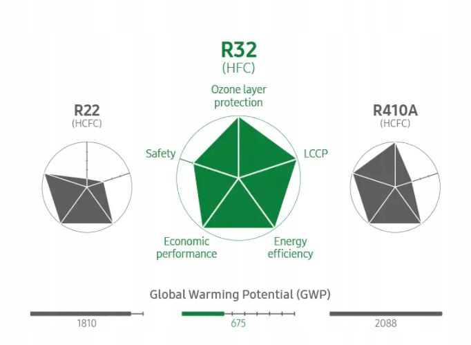 Захистіть нашу планету, зменшивши шкідливий вплив зміни клімату. Кондиціонер використовує холодоагент нового покоління R32, який допомагає захистити озоновий шар і має низький вплив на глобальне потепління порівняно зі звичайними холодоагентами, такими як R22 або R410A. Це робить його набагато екологічнішим.