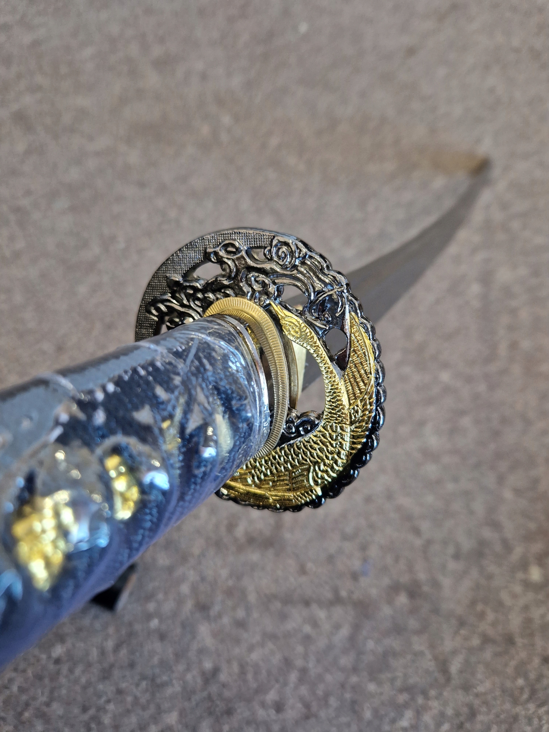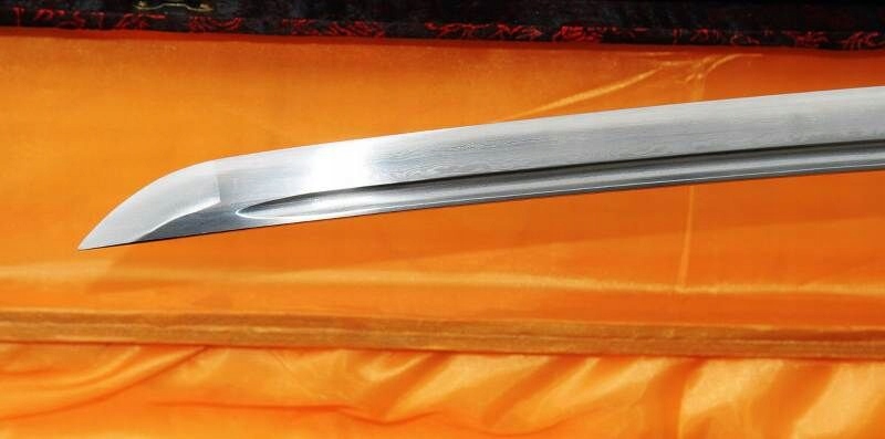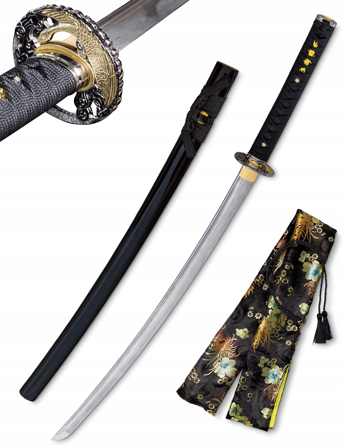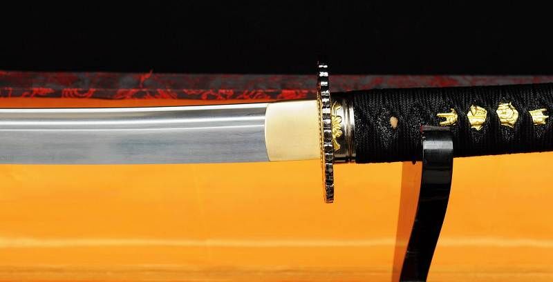 Катана, виготовлений у традиційному японському стилі з мульти -ланцюгового, торкаючись у різних умовах високої вуглецевої сталі. Цей процес разом із процесом зникнення меча після нього триває до тижня. Потім протягом двох тижнів лезо заточується камінням різної зернисті, що дозволило отримати дуже гострий катана. Менукі. Ручка ручки, що складається з двох дерев’яних тріщин, шкіряних променів Самагава. Jelec Tsuba, виготовлений з кольорових металів. У Jelc Tsuba кільце Фучі розташоване зміцнення ручки. У верхній частині леза - дорогоцінний металевий комір.