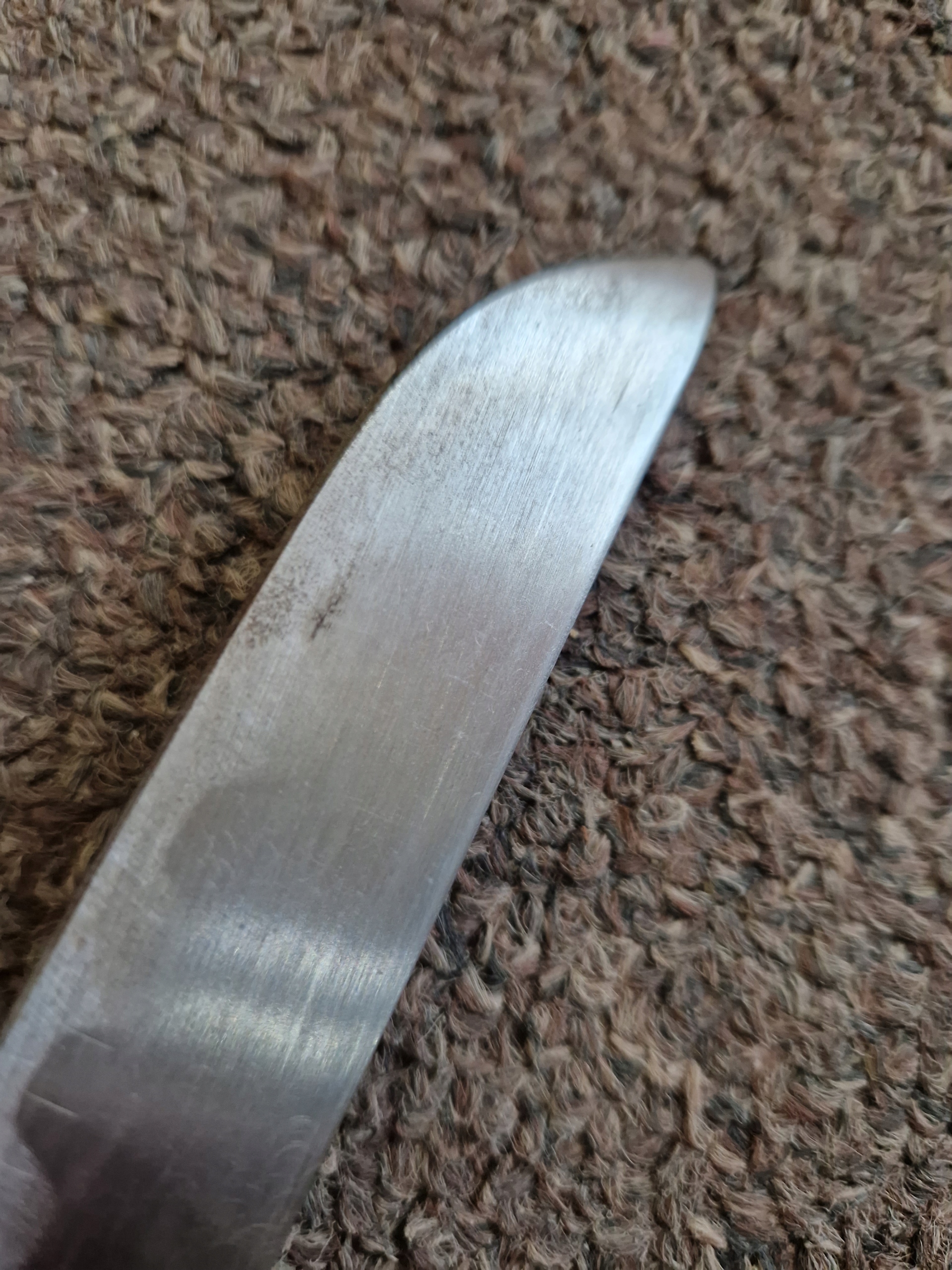 Опис пошкоджень: окреслений на піхві та лезі, іржа на лезі, осколок на підставці