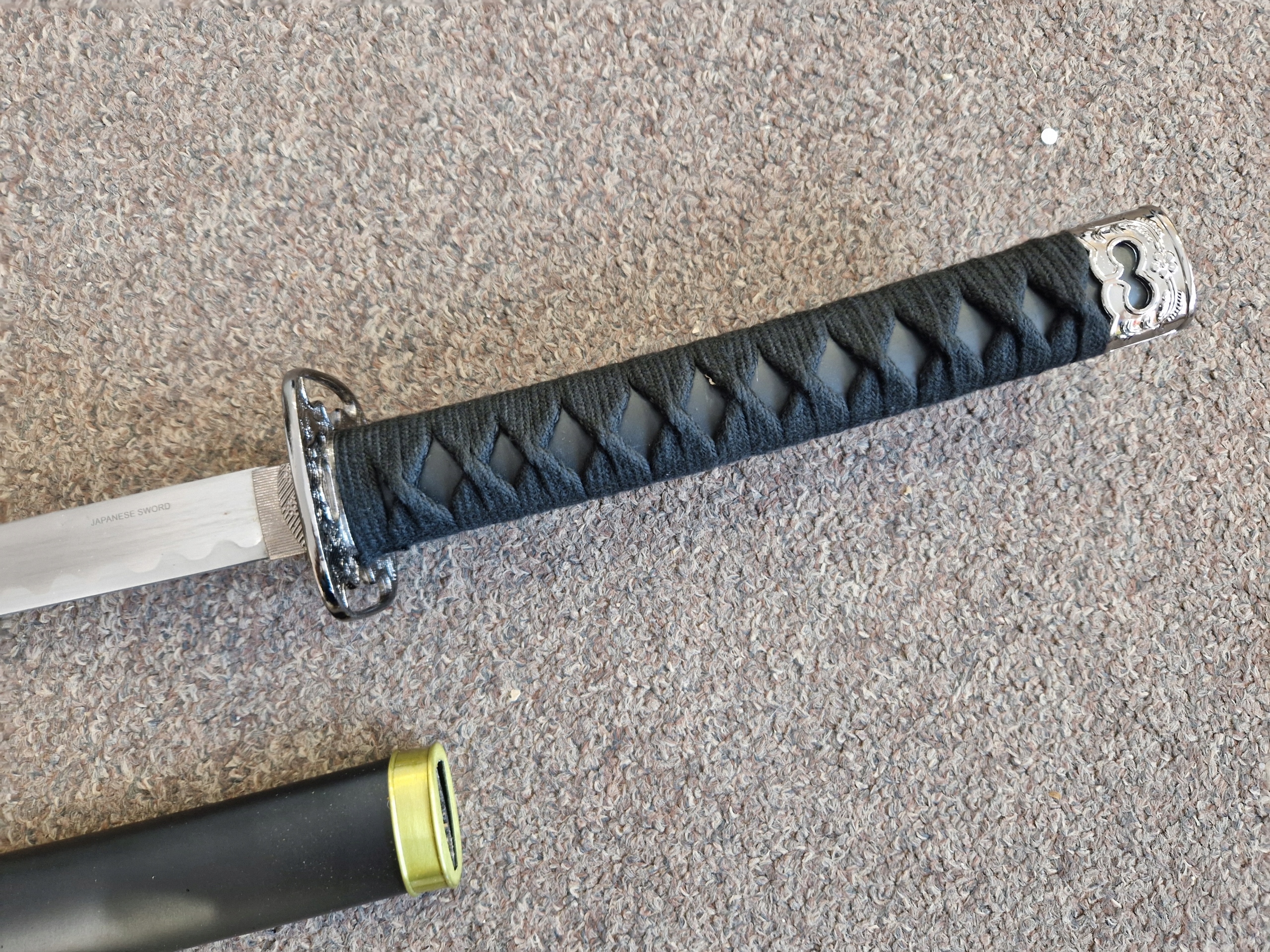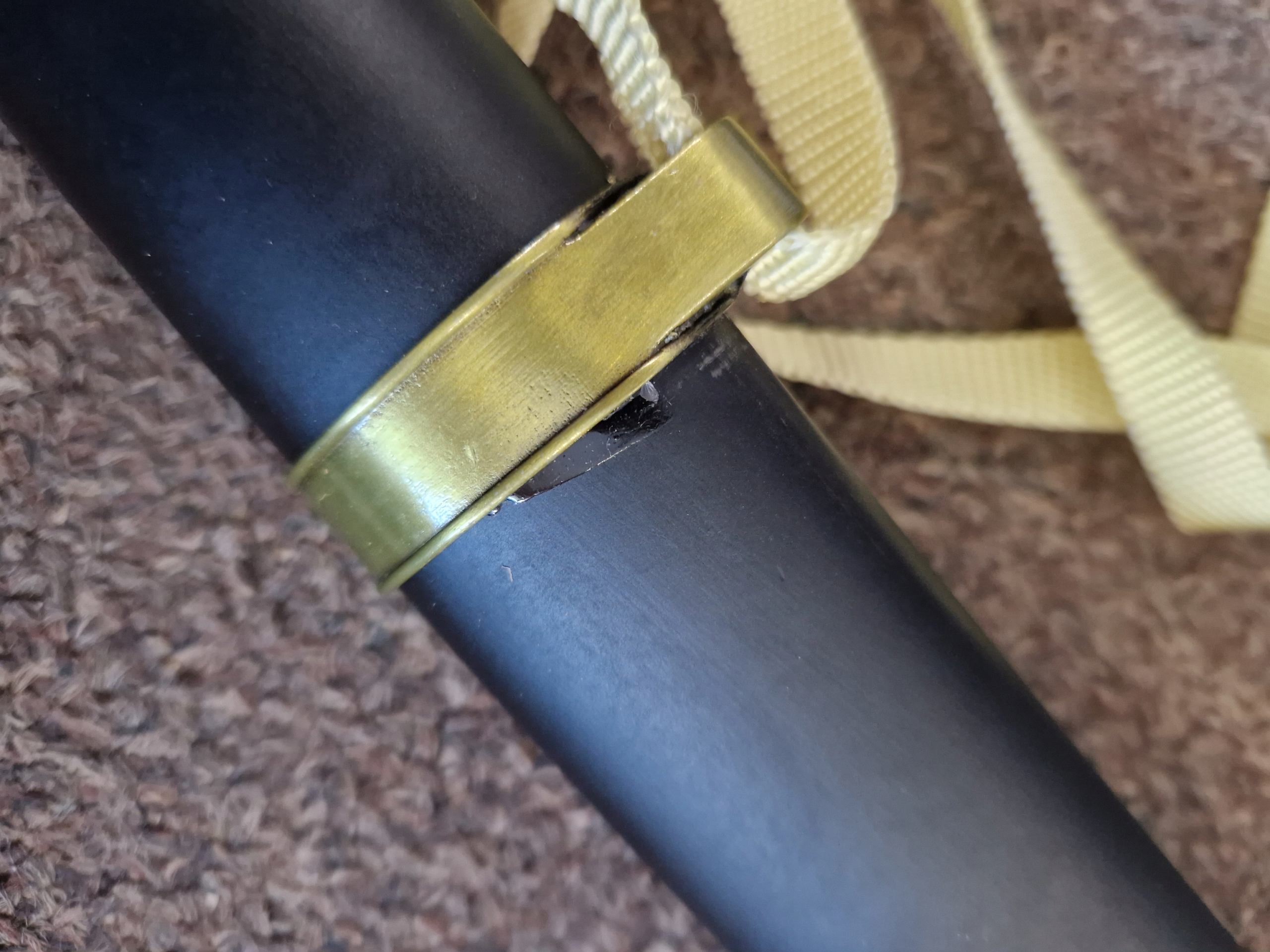 ОПИС ПОШКОДЖЕННЯ. ЛЕЗО НЕ ПОВНІСТЮ ВХОДИТЬ В ПІХВИ, НА ПІХНАХ ВИДИМО КЛЕЙ, ДРЯПИНИ ТА ПОШКОДЖЕННЯ, ПІДСТАВКИ НЕМАЄ. МОЖЛИВІ ТРІЩИНИСамурайський меч катана TL492-395CA або прикраса