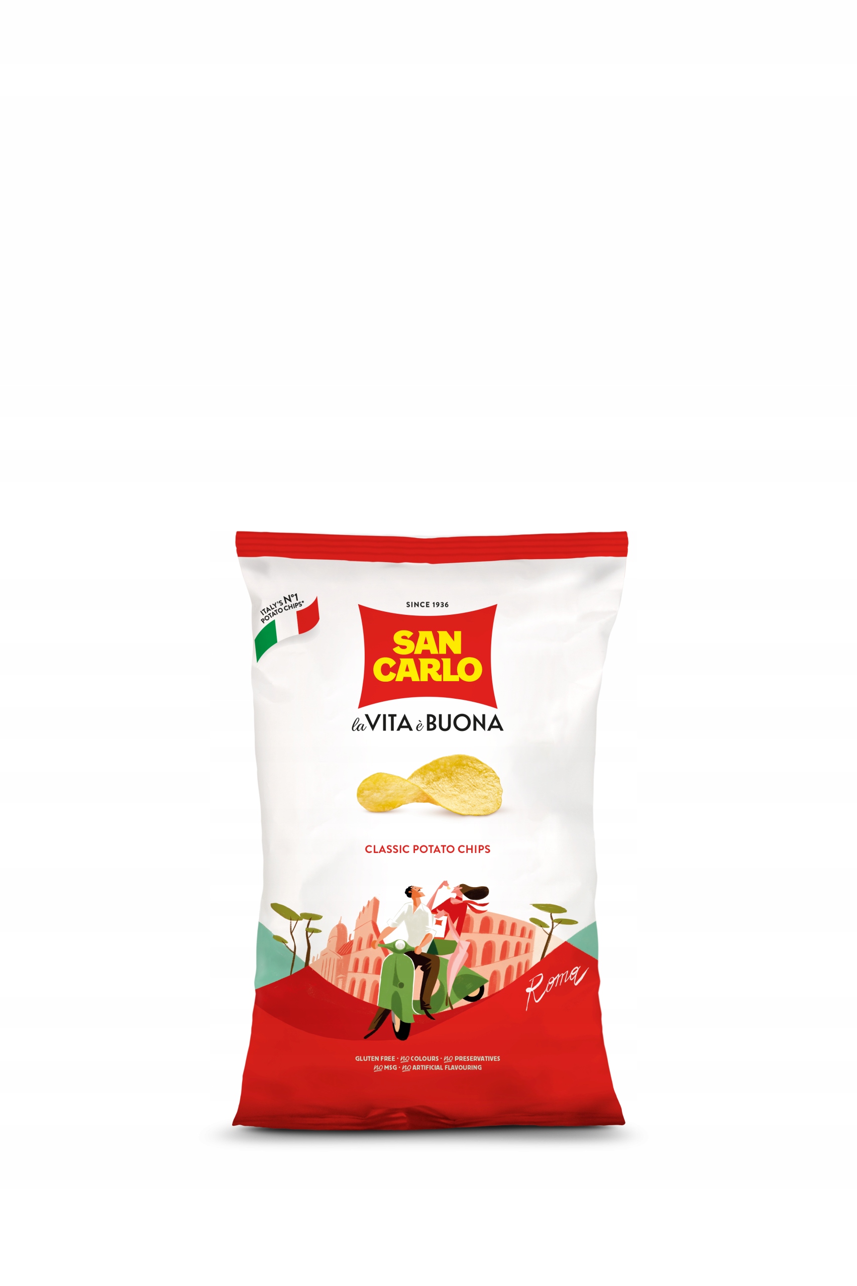 Найбільш традиційні картопляні чіпси з Сан -Карло - бренд №1 в Італії. Хрусткий і злегка солоний, вони мають простий, але захоплюючий смак. Класична закуска, яка ніколи не набридне. З іншого боку, такий захоплюючий. Так само, як скутер їзда навколо Риму.