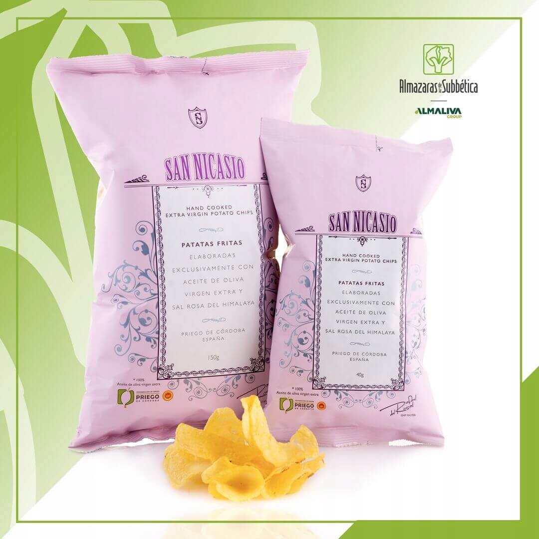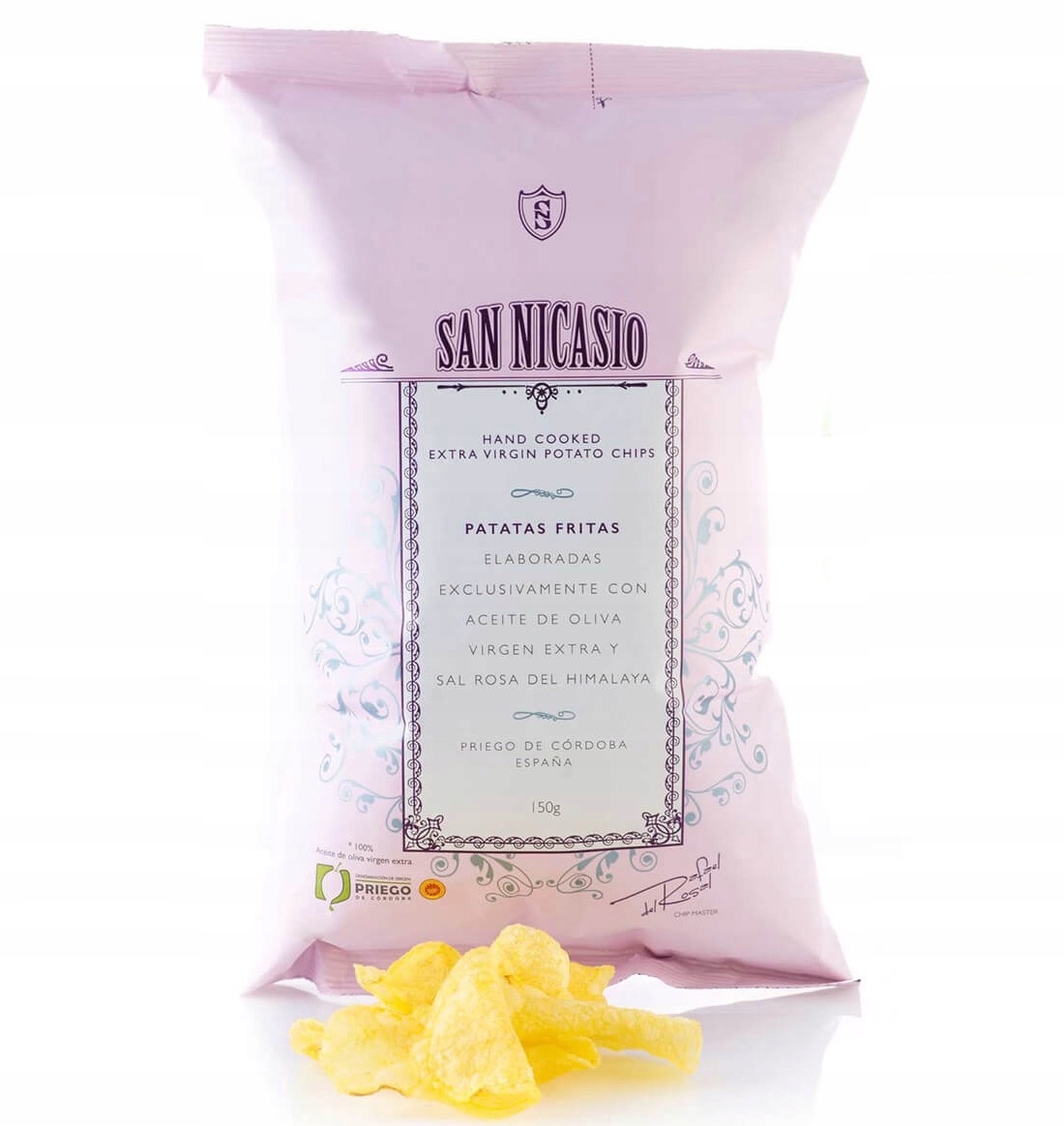 лише 3 прості інгредієнти. картопляні чіпси Сан -Нікасіо є іспанською картоплею з культур, де ГМО не використовується (картопля не генетично модифікована). Повільно запечений з додаванням рожевої солі з Гімалаїв на найкращій оливковій оливковій олії Extrawiw Doi De Duartoba, виробленому Almazaras de la Subbética.